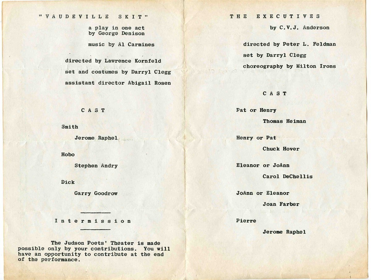 A 4 page program from a presentation by the Judson Poets Theatre of Vaudeville Skit and The Executives in 1962 at the Judson Memorial Church on Washington Square South in New York City