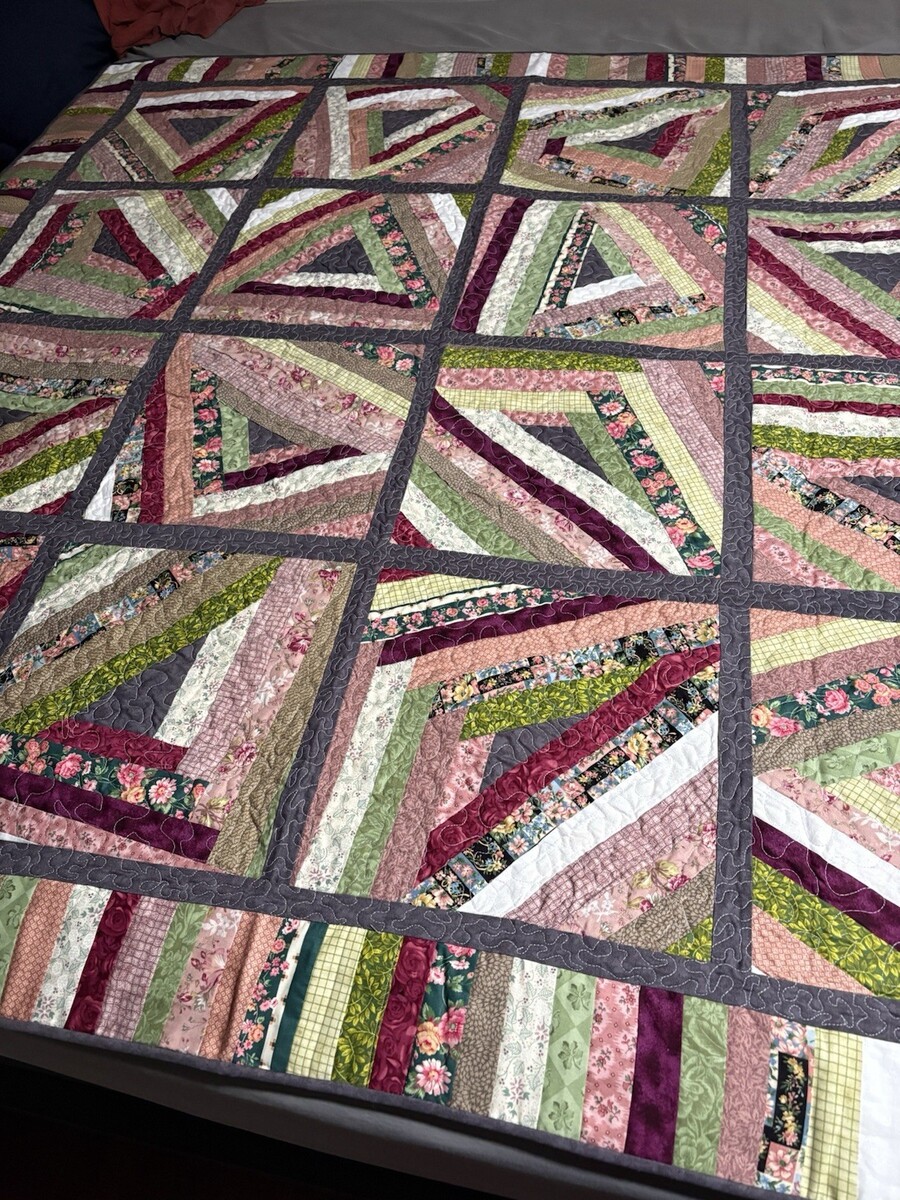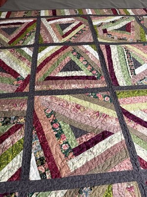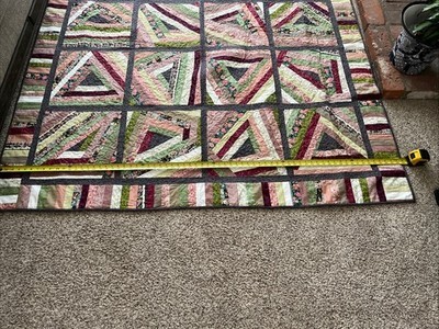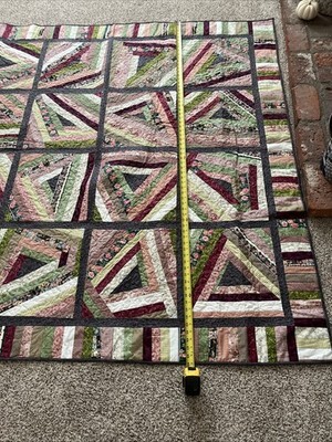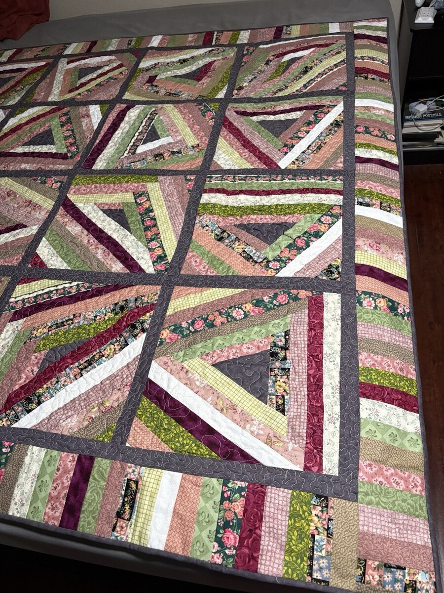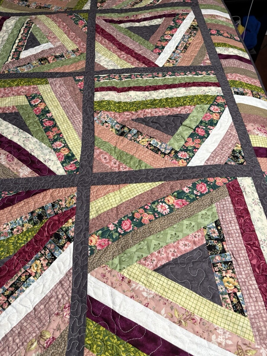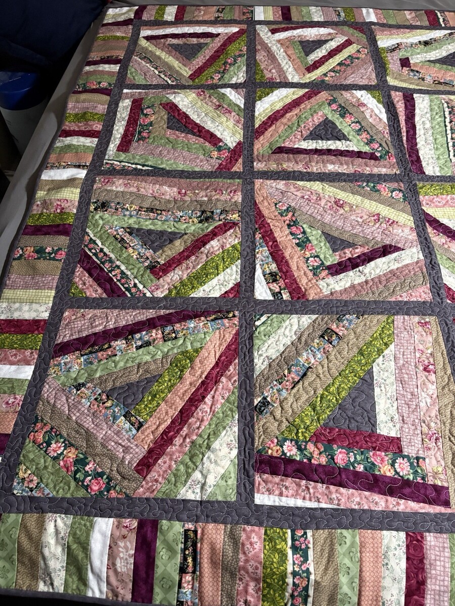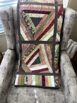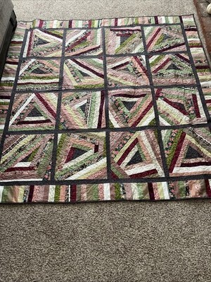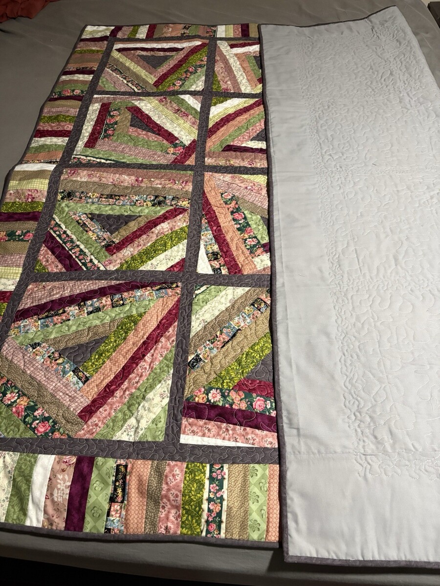 Handmade “String Beans” Quilt Lap/Throw, BedTopper Grn Burg Floral 69”x69” NWOT