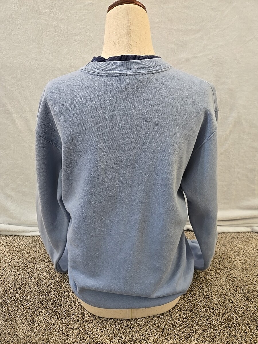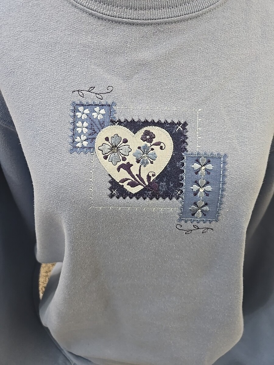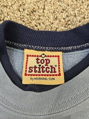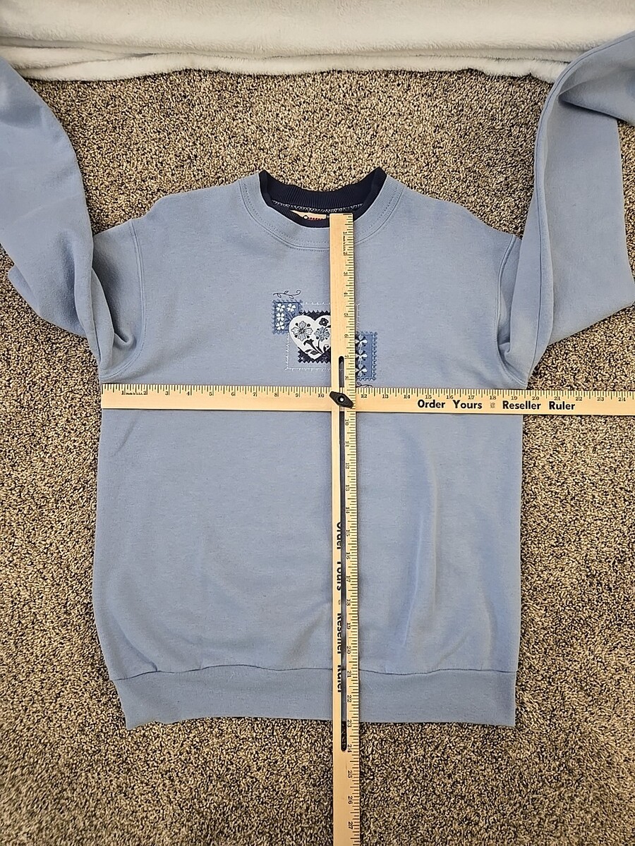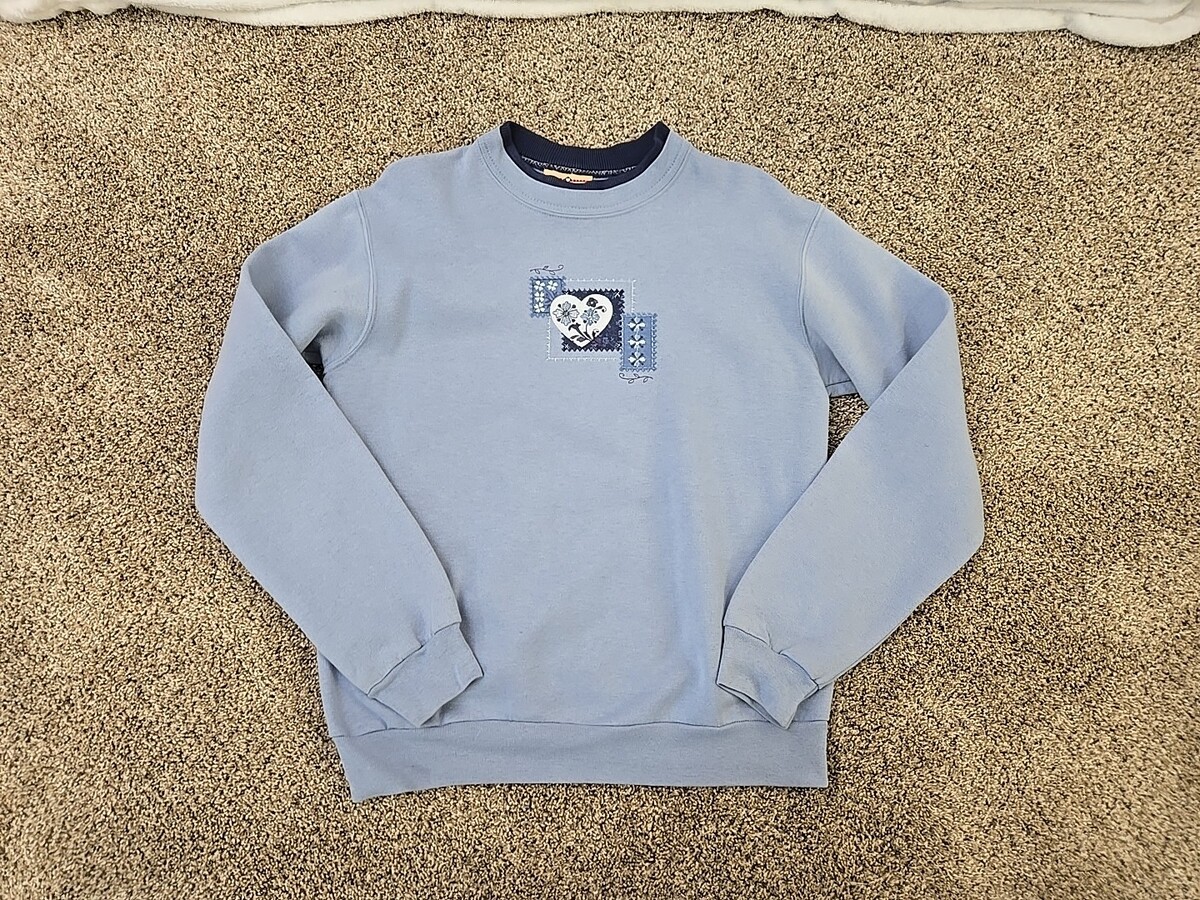 The Top Stitch Morning Sun Vtg 90s Valentines Cottagecore Sweatshirt is a women's size small vintage sweatshirt from the 1990s. It features a blue color with a special occasion arts crafts look, made of original cotton material in Mexico. This sweatshirt, with its unique design, is perfect for those who appreciate vintage clothing and want to add a touch of nostalgia to their wardrobe.