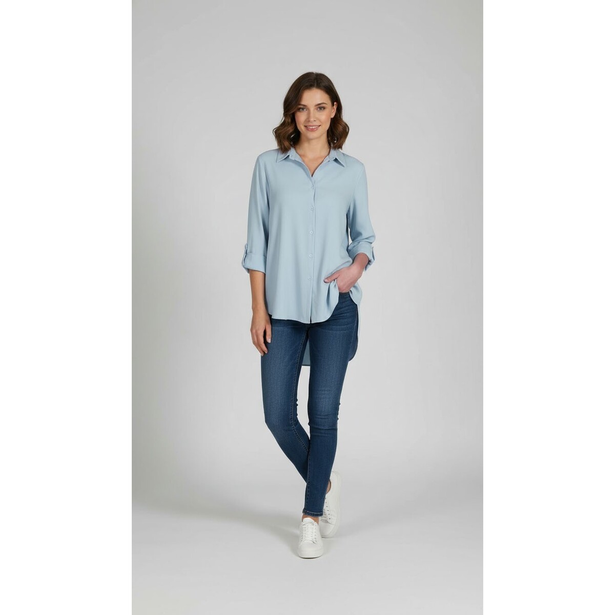 Elevate your everyday style with this chic light blue collared shirt. Designed with a flattering high-low hemline, this top offers a modern silhouette that drapes beautifully. The roll-tab sleeves add a touch of relaxed sophistication, perfect for transitioning from day to night.