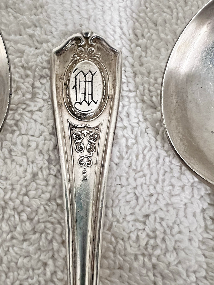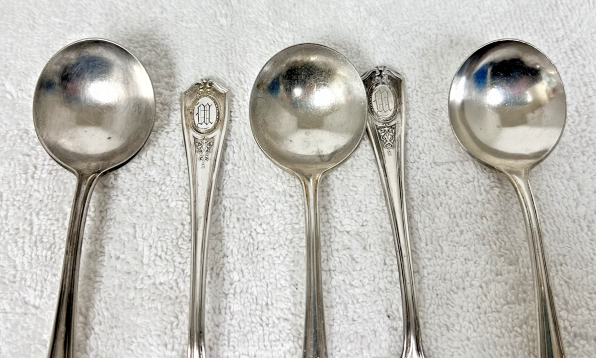 5 Antique circa 1911 Oneida Community Silverplate Louis XVI Flatware Soup Spoons Monogram "M". Each round soup spoon measures approx. long. Has a script "M" monogram on the handle. All are in very good used condition. Some signs of use but no damage, dents, bends. Might need cleaning. See pictures.