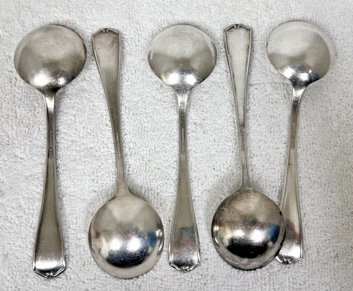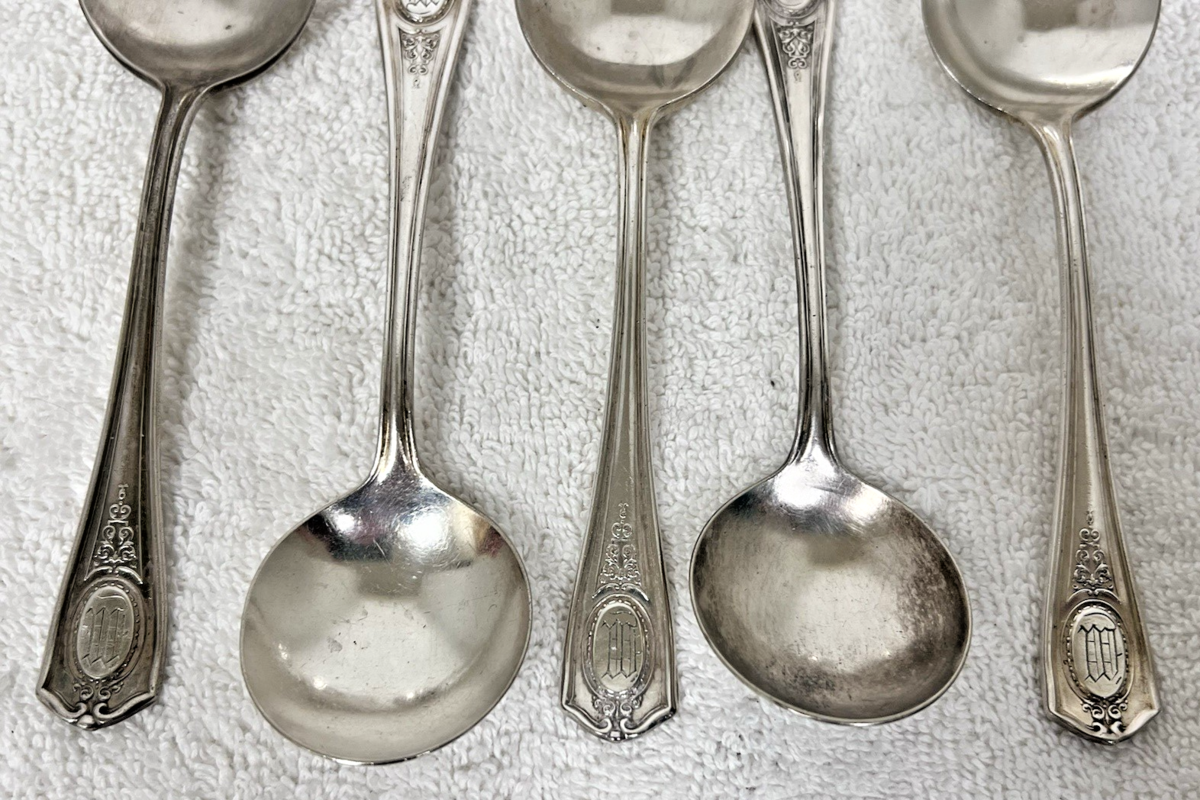 5 Antique Oneida Community Louis XVI Silverplate Flatware Soup Spoons w Monogram