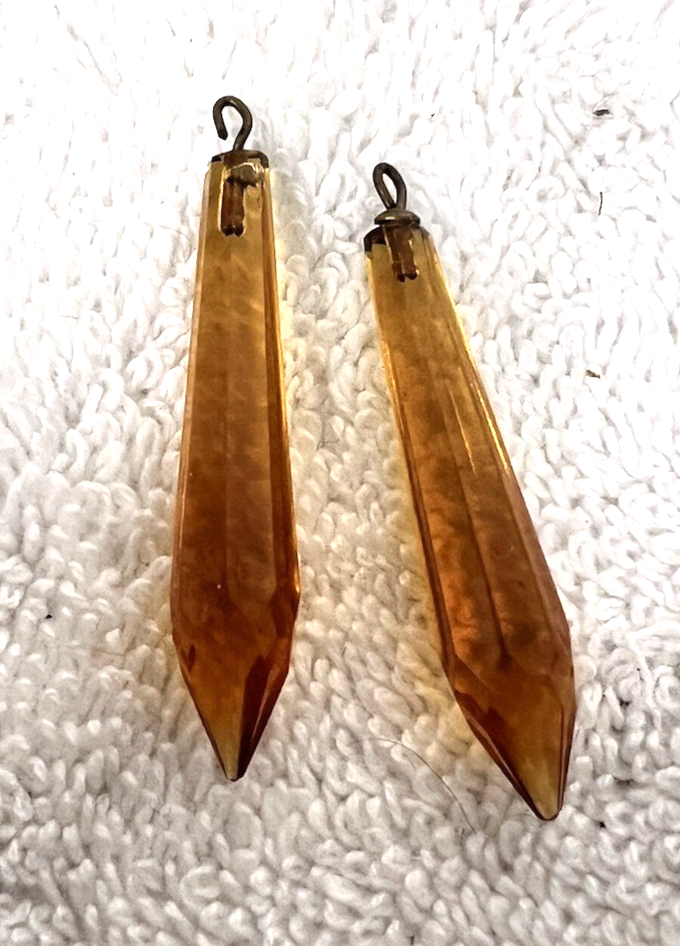 Vintage Amber Glass Hanging Chandelier Prisms Beads measure approx. 1 5/8? Drop Length. Pretty great condition amber prisms beads would make great earrings or a part of an old original chandelier. No damage original brass attachments at top. See pictures.