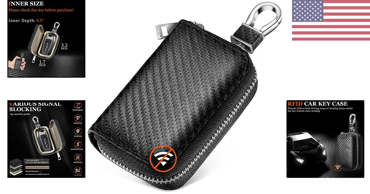 Protect your car key fob from potential theft with our Waterproof Carbon Fiber Car Key Holder Faraday Bags. Made of durable carbon fiber pattern leather material, these bags are waterproof, safe, and non-toxic. They provide a signal preventer for your vehicle key fob, shielding against break-ins and giving you peace of mind.