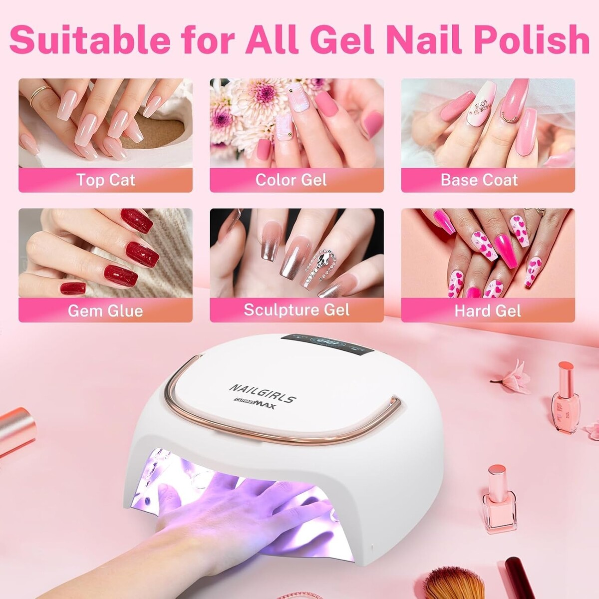 Compatible with a variety of gel products: Base coats, top coats, color gels, hard gels, and more.