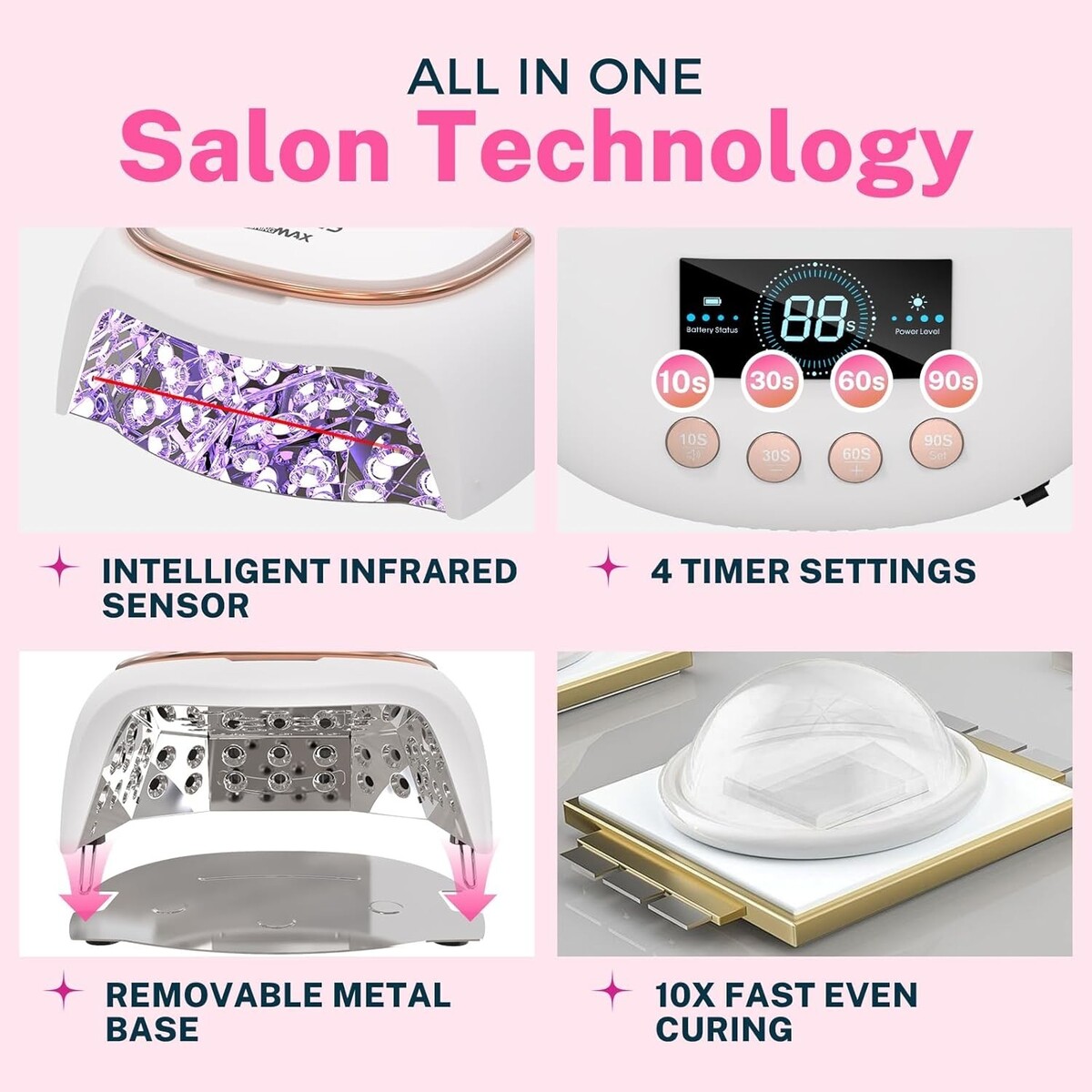 Features: Auto-Sensing,LCD Display,Low Heat Mode,Fast Curing,Auto-Sensor,4 Timers,Flash Cure,Infrared Induction,Removable Bottom Tray,Precision Light Control,Mirrored Metal Baseplate