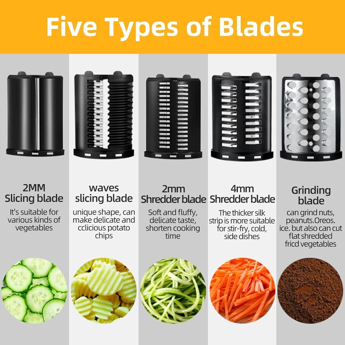 ?5-in-1 Multi-Functional electric vegetable slicer? equipped with five types of blades, including coarse line blade, fine line blade, slicing blade, wavy blade and grating blade, which can satisfy your cutting needs for different ingredients.