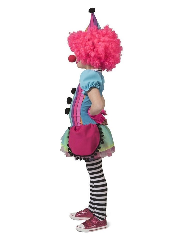 Get ready to make your little girl's day with this colourful and complete rainbow clown outfit. The costume includes a hat, tights and a polyester material for a comfortable fit. The multi-coloured design is perfect for any occasion, whether it's a party or a dress-up game.