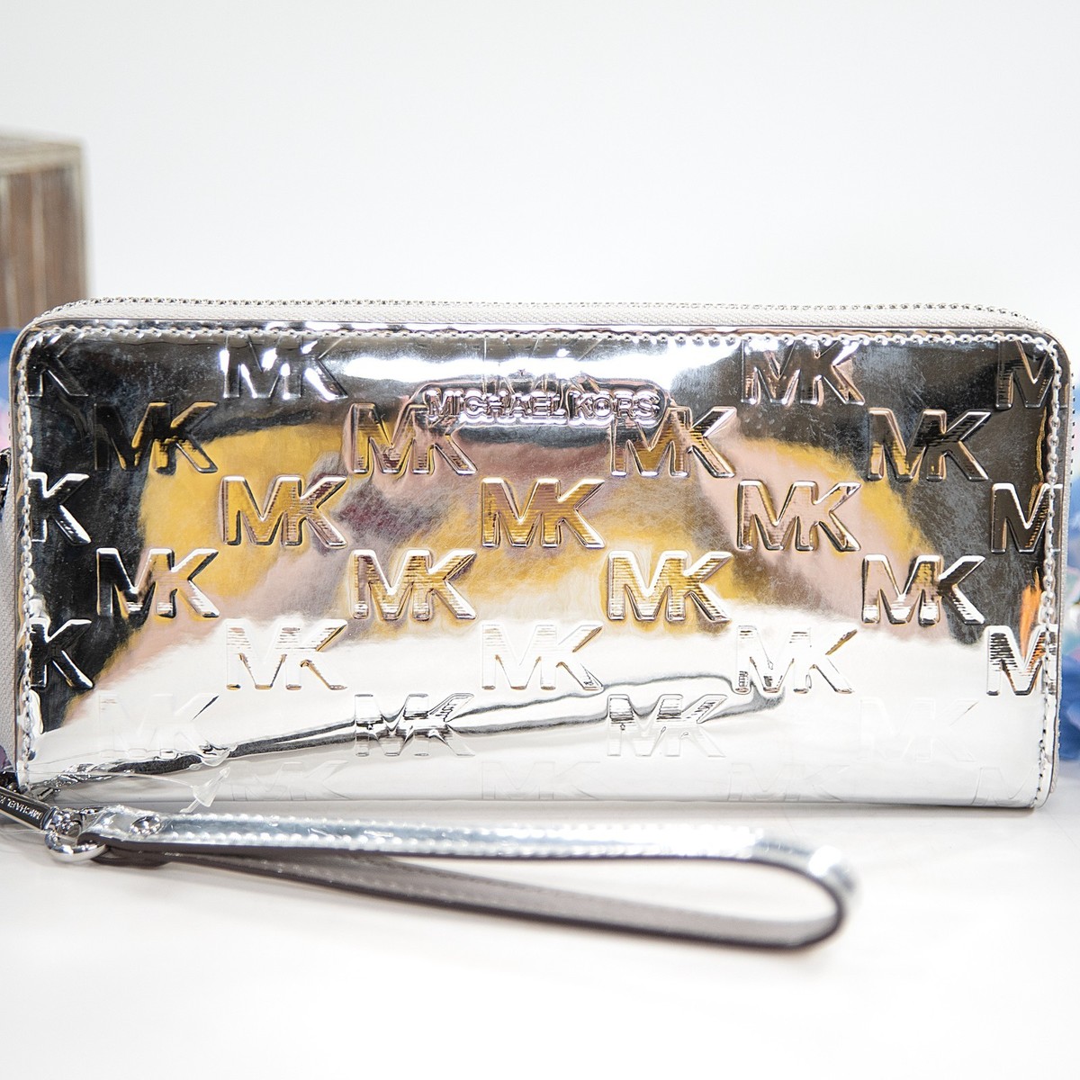 Michael Kors Silver Embossed Monogram Logo Leather Zip Around Travel Wallet NWT