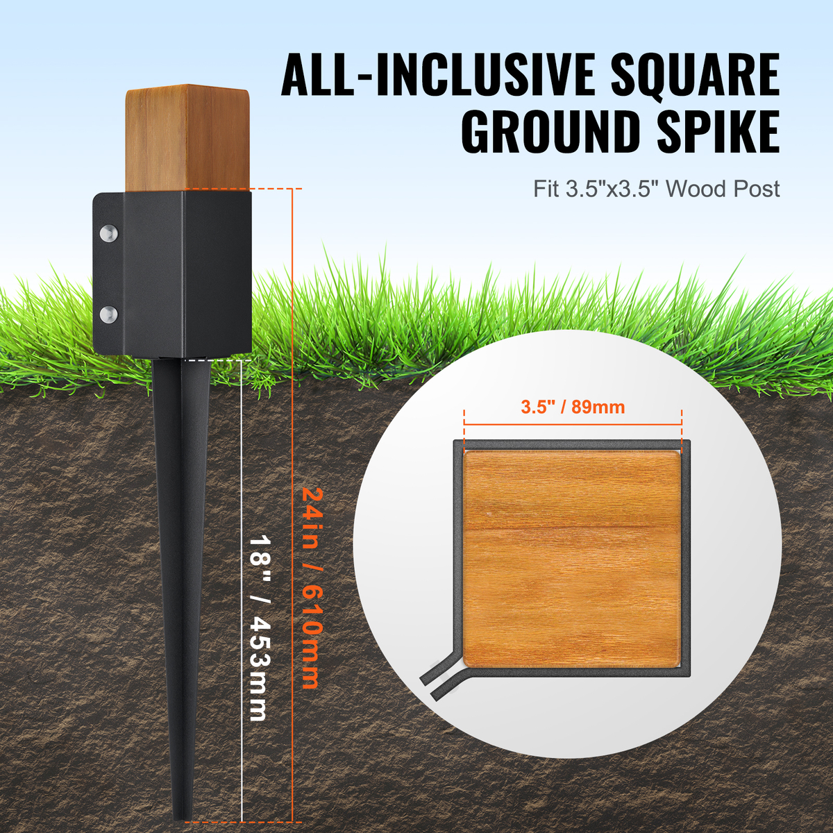 Fits 3.5” Wood: The square spike has a total height of 24 inches, a nail length of 18 inches, and an inner width of 3.5 inches. It is suitable for 3.5” x 3.5” square timber, providing excellent support.