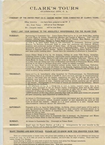 A large single page with blank back. Clark's Tours of Guatemala City Itinerary for the United Fruit Co Quiche Mayan Tour Itinerary . Included a 7 day tour by train and bus. With detailed itinerary and travel instructions. Circa 1930's - 1940's