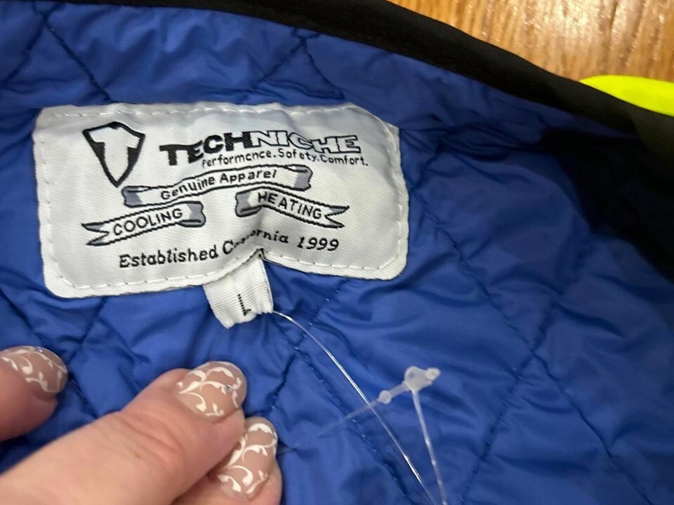 Bright yellow quilted safety vest with reflective properties for enhanced visibility. Features black trim and adjustable side straps for a secure fit. Lightweight and comfortable, ideal for outdoor activities or work requiring high visibility. Brand new with tags attached.