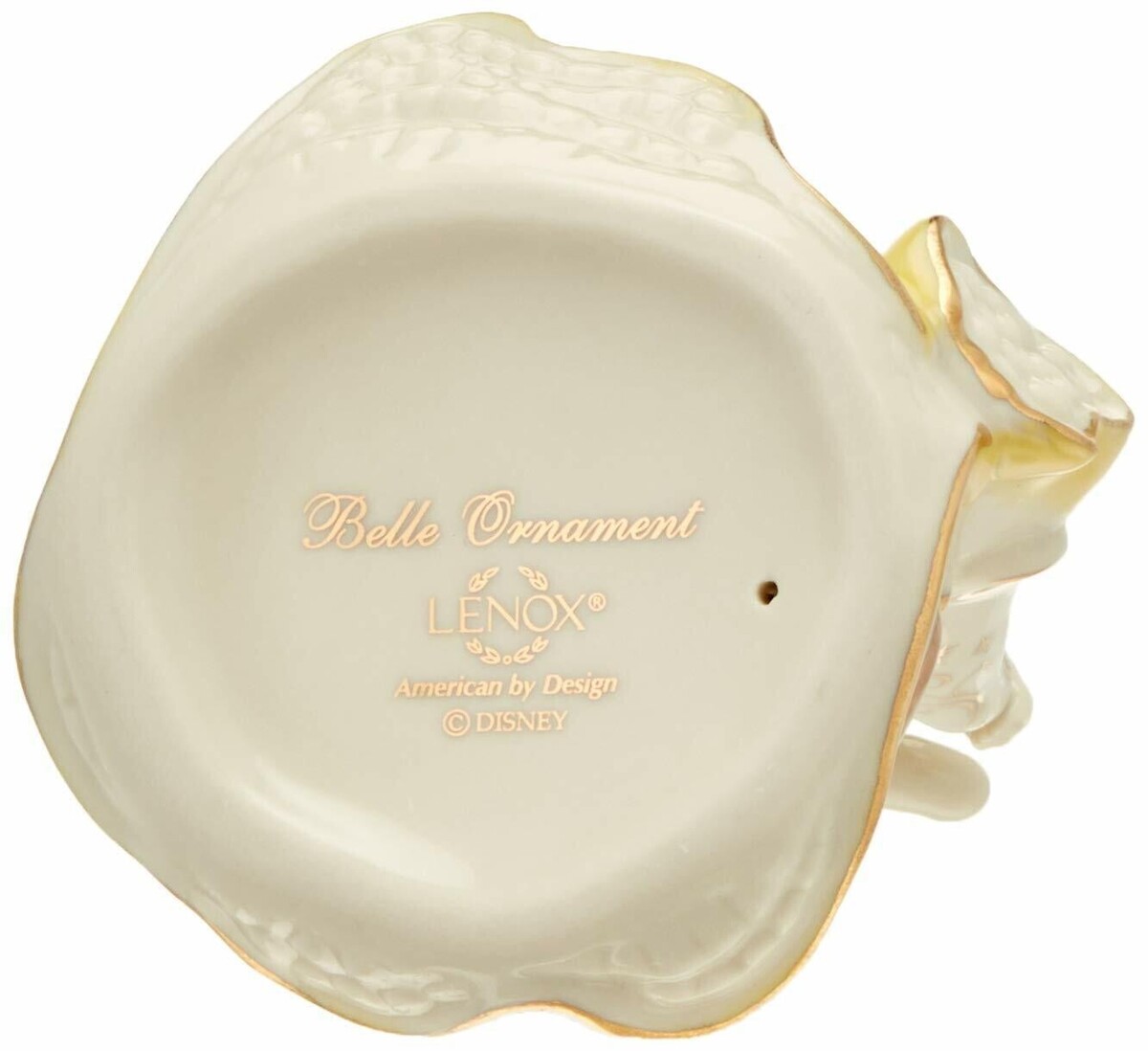 Painted entirely by hand, and accented in gold, this elegant ornament portrays lovely Belle in an off-the-shoulder gown holding a basket with a gem.
