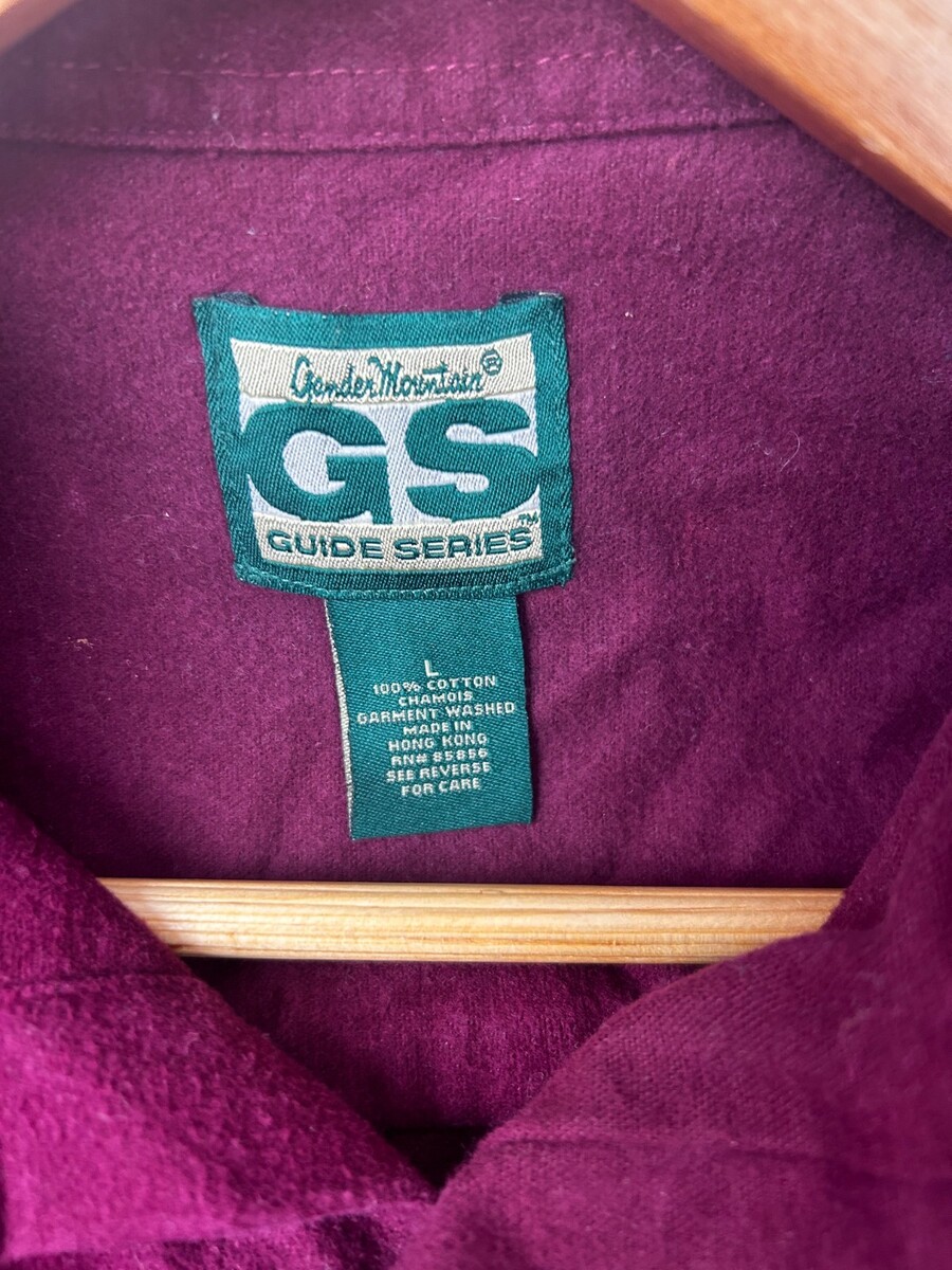 Cabela?s Guide Series long sleeve button-front shirt in burgundy/maroon. Soft chamois cloth feel (thick cotton), perfect for fall/winter layering. Features spread collar, two chest pockets with button flaps, button cuffs, and back yoke with pleat.