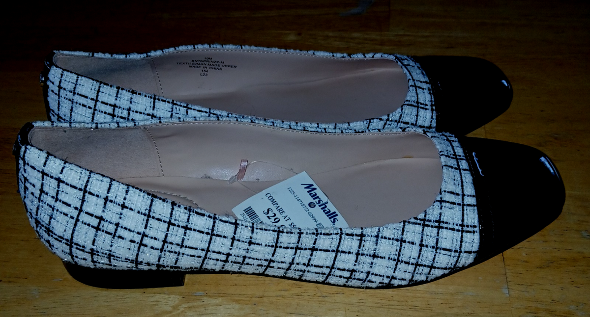 THIS IS A PAIR OF BANDOLINO LADIES BLACK/WHITE FABRIC FLATS W/BLACK PATENT TOE/HEEL/ACCENTS IN A SIZE 10M. THEY ARE NEW, WITHOUT THE BOX--TAG IS ON THEM--COMPARE AT PRICE $50--SALE PRICE $29.99.