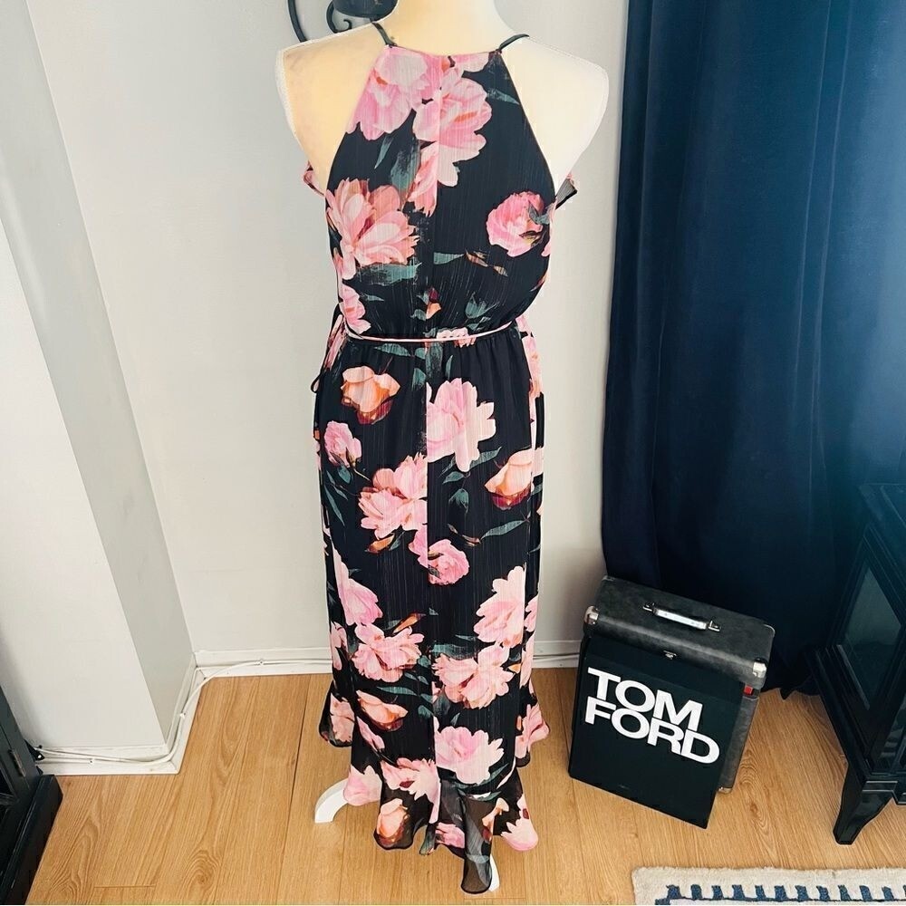 Jennifer Lopez Faux Wrap Ruffle Maxi Dress, Black/Pink, Size 2, Summer Wedding