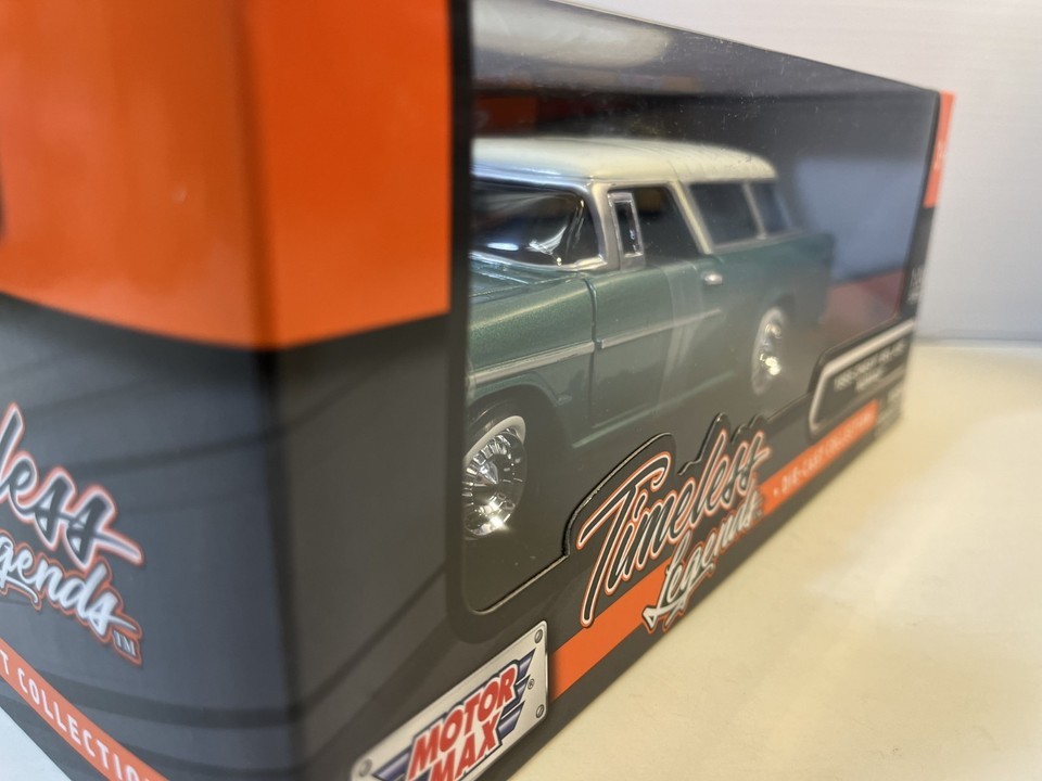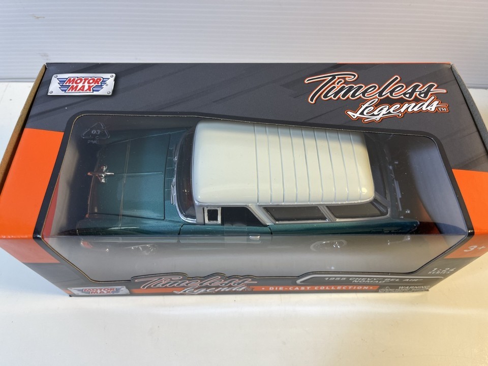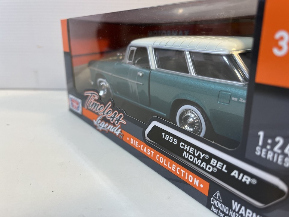 1955 Chevy Bel Air Nomad Model Car: 1/24 Scale, New In the Box By Motor Max. This Diecast car checks all the boxes for a reasonably priced rendition of the classic die cast 1955 Chevy Bel Air Nomad.
