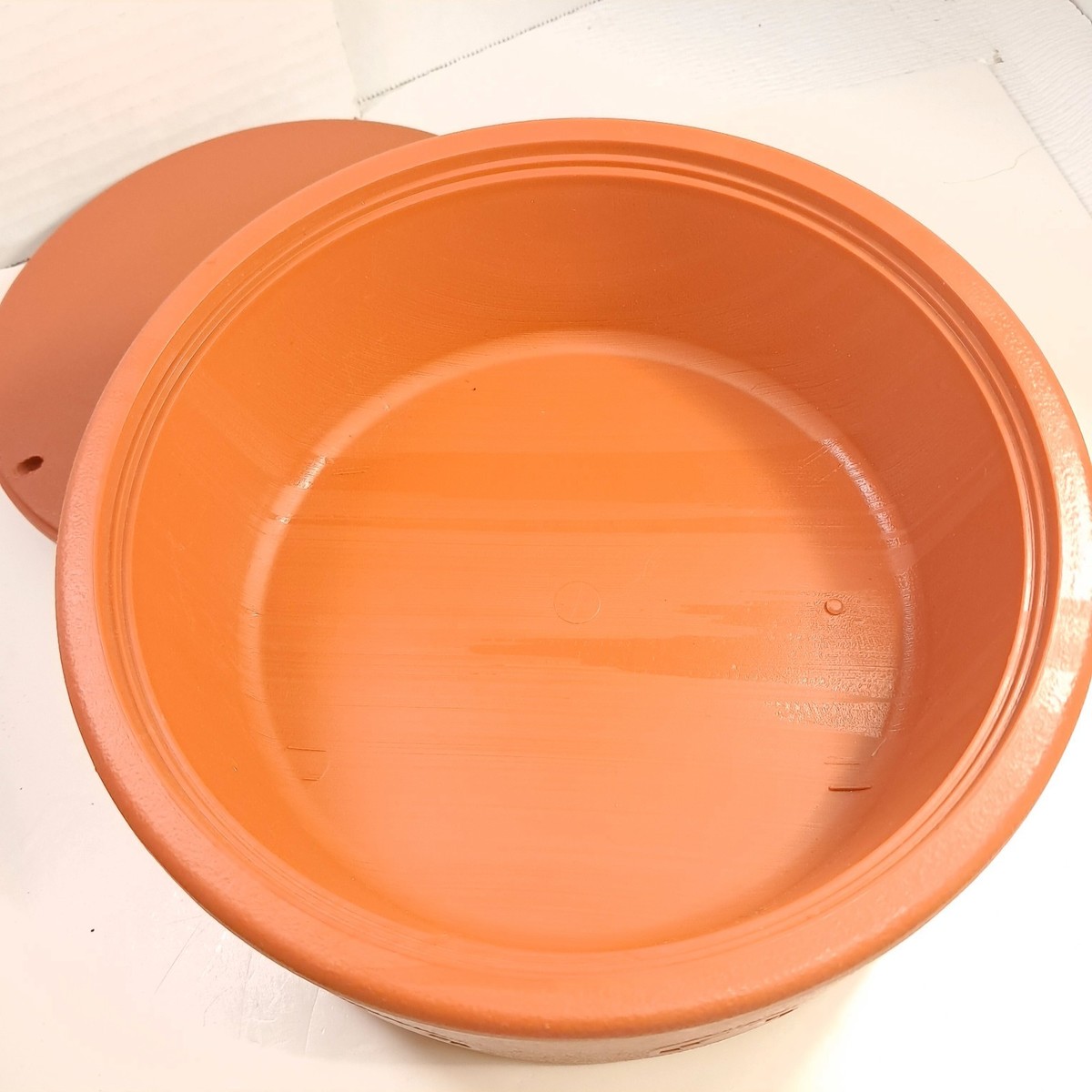 Rust terracotta/orange color. Plastic. Very good to excellent condition