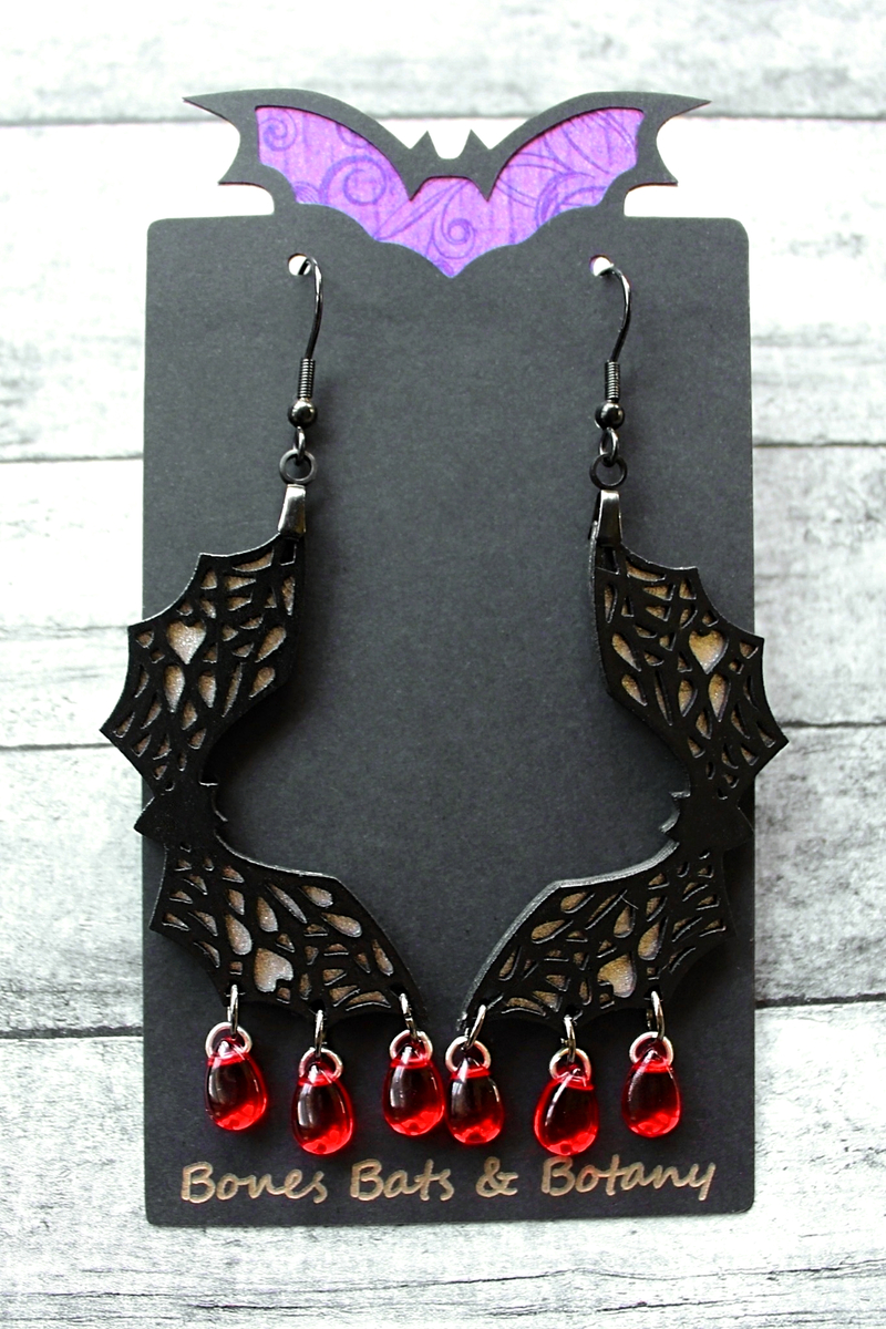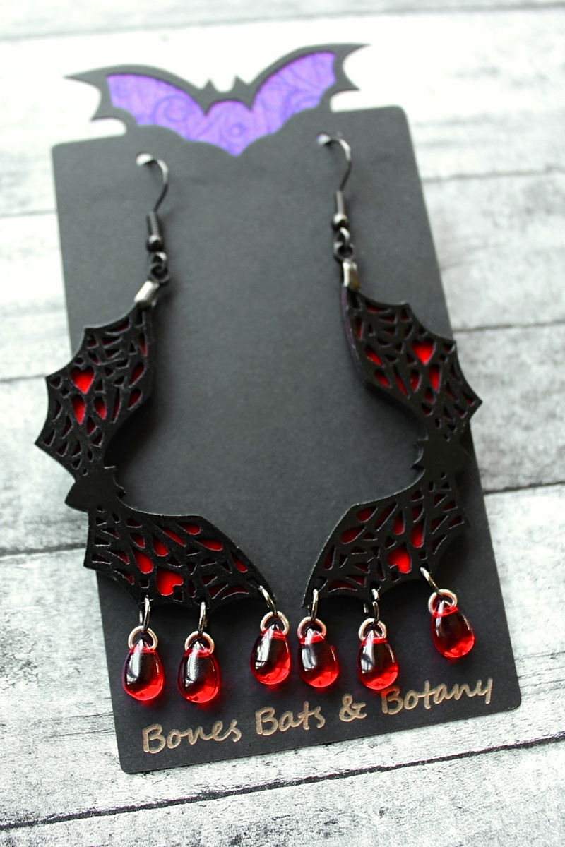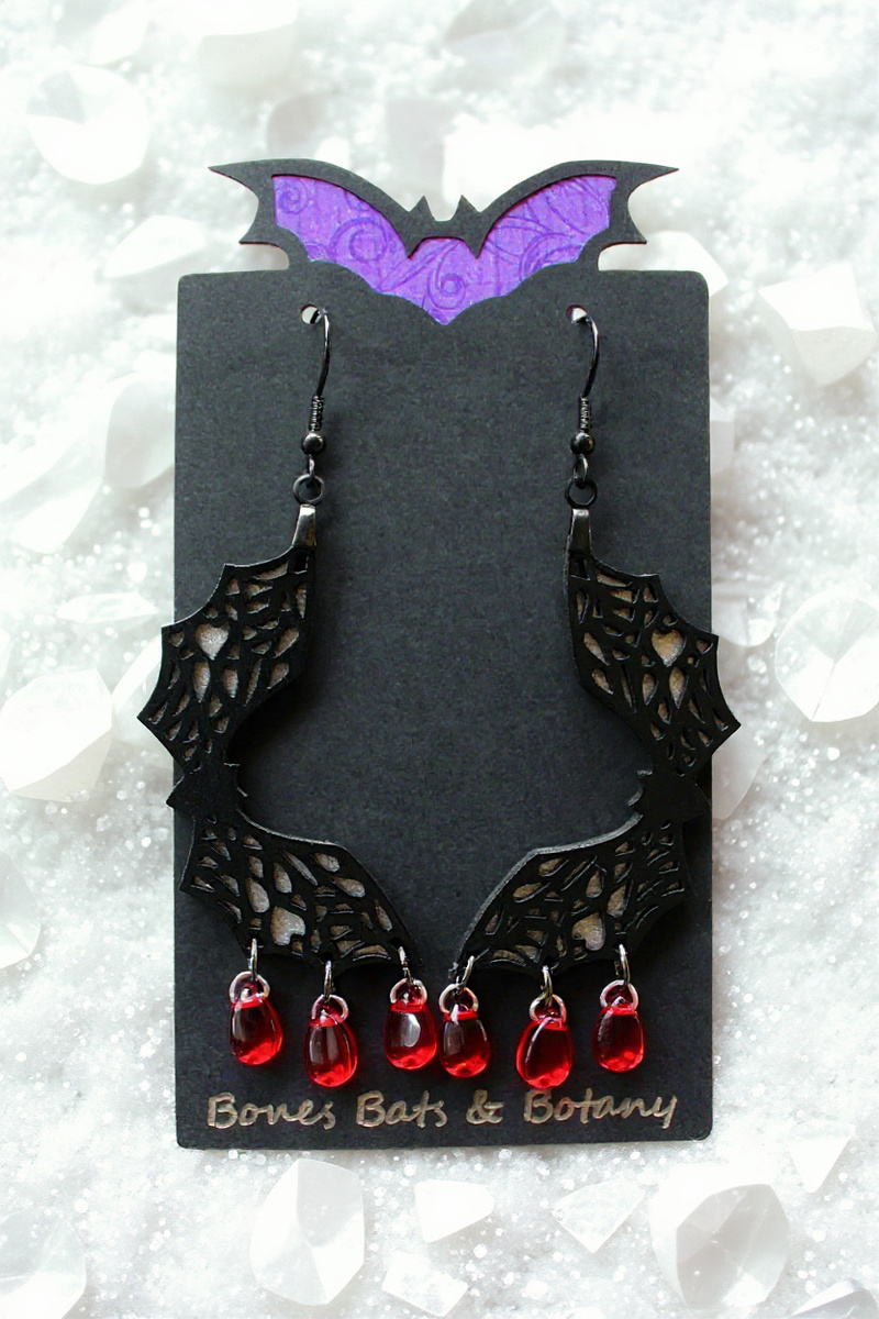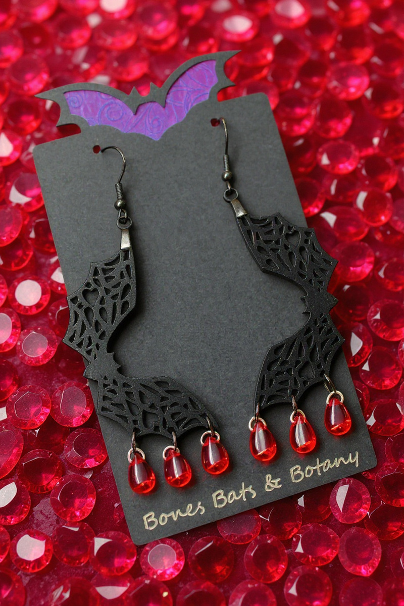 Handmade Lace Bat Earrings, Spooky Blood Drop Earrings, Horror Gothic Jewelry