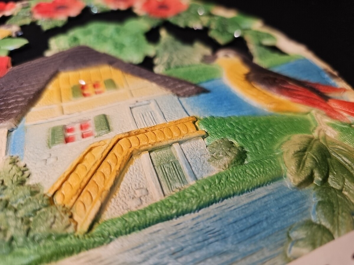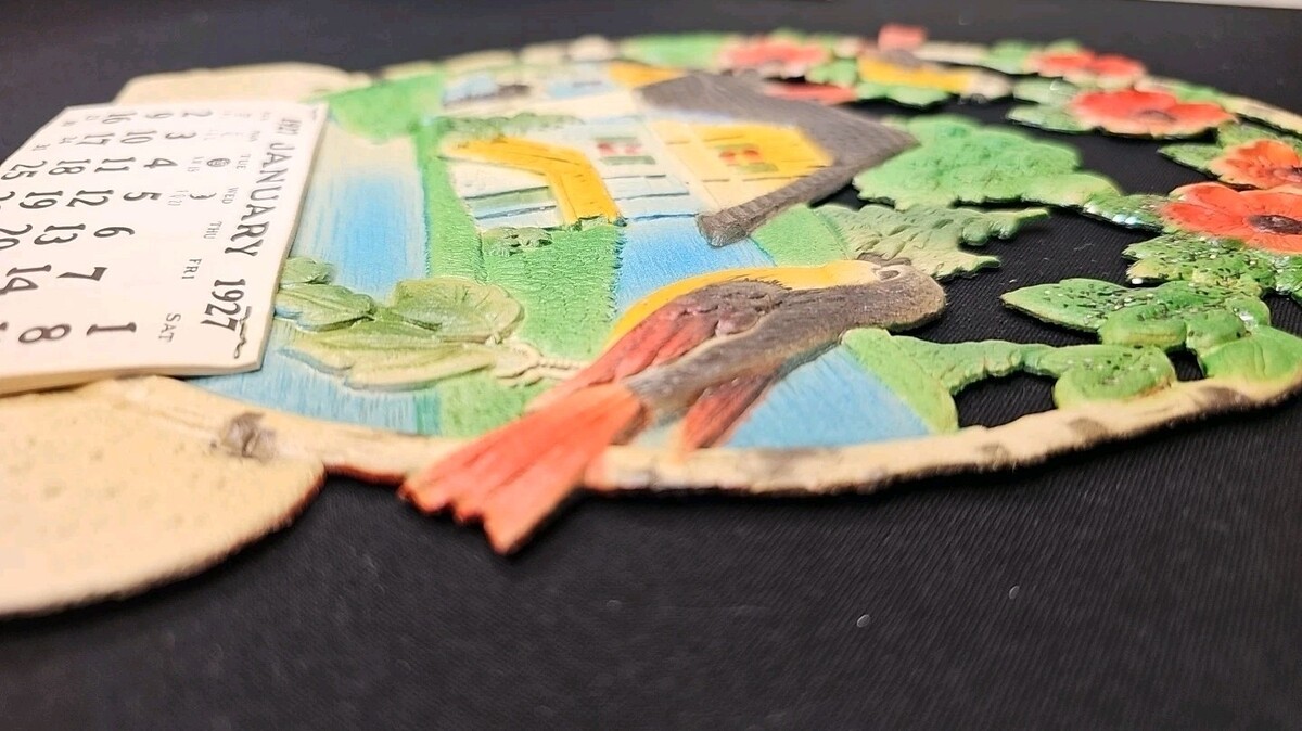Original antique 1927 die cut embossed paper calendar featuring a scenic cottage design with birds and floral details. Beautifully layered pressed paper construction with vibrant color and dimensional detail typical of high-quality early 20th century decorative calendars.