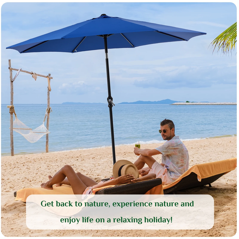 [LIGHTWEIGHT IRON POLE] Our backyard umbrella is made of a light weight iron pole and 8 steel ribs, coated in a rust-free matte finish. The poles unscrew for easy storage, preventing rust and making it lighter than traditional steel pole umbrellas. [DURABLE FABRIC] Enjoy the outdoors with our 9 feet diameter patio umbrella, featuring high-durability polyester designed to keep you cool and comfortable. With a 9 FT diameter, it shades at least 5-6 chairs and a table, ideal for residential and commercial use. [TILT CRANK SYSTEM] You can easily open and close the umbrella with crank system designed for this umbrella. The push button tilt technology enables effortless tilting. [WIND VENT] Stay cool with the wind vent feature, allowing for proper air and heat ventilation. Rust-free powder coating ensures our patio umbrella is resistant to rust, corrosion, and peeling. [MULTIPULE USES] edx 9 feet patio umbrella with elegant design, is perfect and essential for summer or sunny days to shade sunshine, apply to the yard, beach, square, garden, and patio shops like cafes, restaurants, and swimming pool.