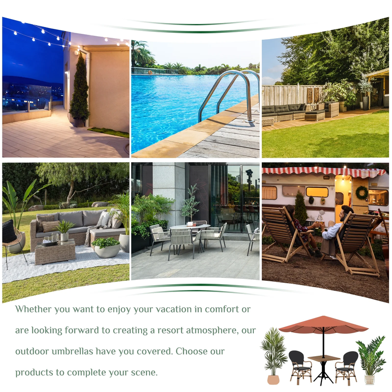 The edx 9-FT Outdoor Patio Umbrella provides shade for gatherings of 4-6 chairs and a table. It is suitable for residential and commercial spaces such as patios, decks, gardens, backyards, pools, and balconies. Made with high-density polyester, it effectively protects against water and UV rays. The umbrella's Double-layer Vent design allows for proper ventilation, ensuring stability even in windy conditions. With the convenient crank system, you can easily open and close the umbrella. The push button tilt technology enables effortless tilting, allowing you to enjoy shade from any angle. Let's enjoy outdoor time with the edx 9-FT Patio Umbrella!