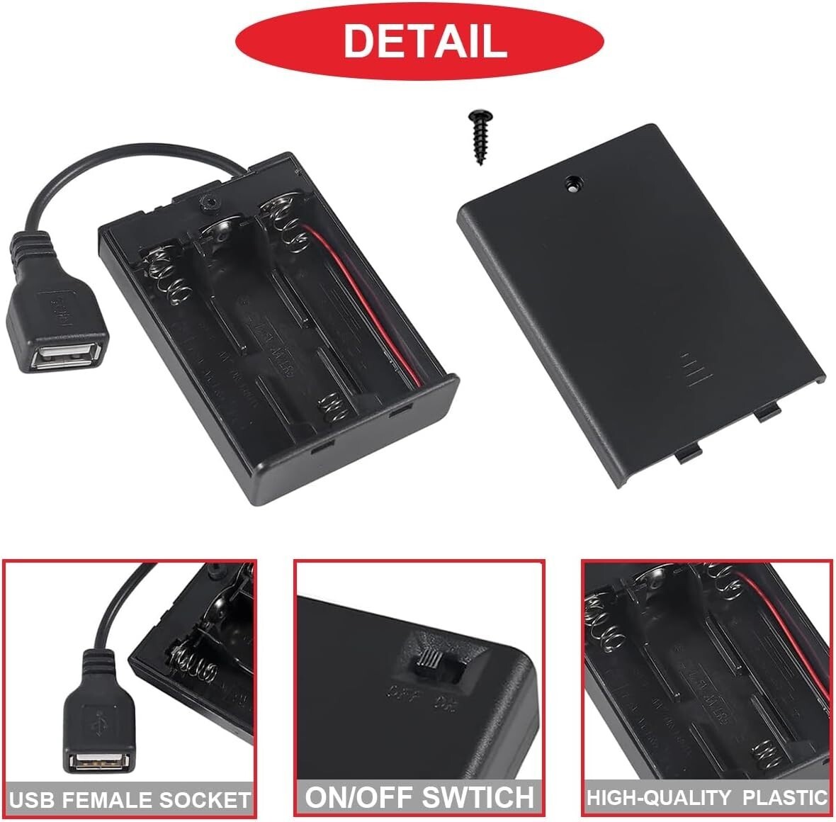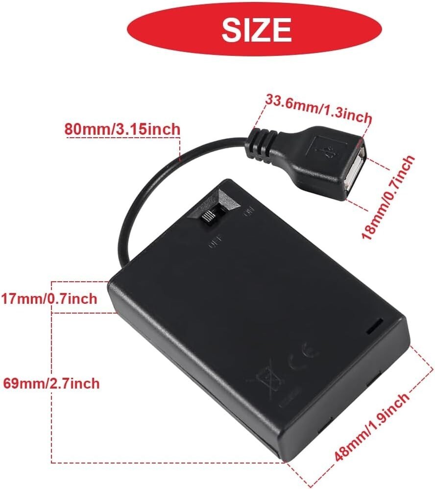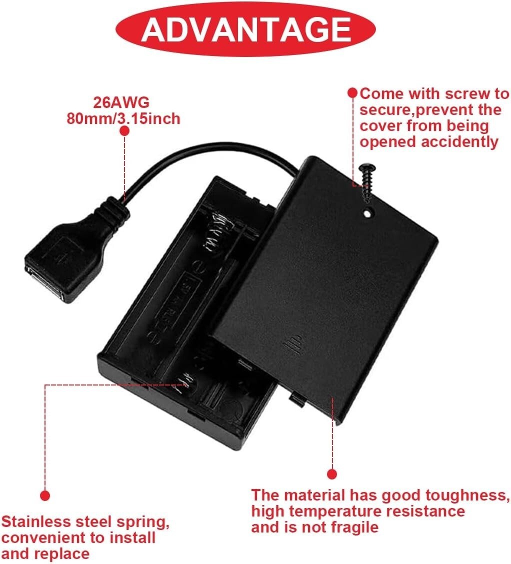 Wide Application. :The AA battery holder with a USB female plug, easy install, convenient to use. It is suit for toys, remote control cars, decorations with lights, electronic engineering or other places where DC power is needed. Adopt flame retardant material, high temperature resistance, durable, not easy to deform. Can be used as an emergency power supply.