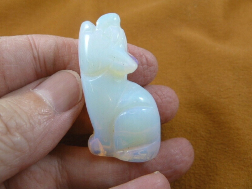 (Internal #Y-COY-SI-565) EXCELLENT, Sitting Howling coyote gemstone carving in polished, WHITE OPALITE GLASS (looks lit from within, has gemstone status though manmade) gemstone, gem hand carved in CHINA. Measures 1-5/8" tall.