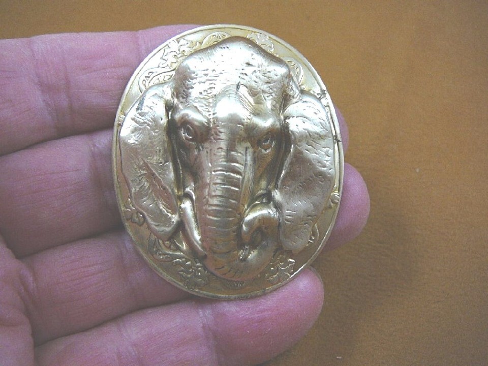 (Internal #B-ELE-154) This is a beautiful stamped repro - brass pachyderm pin/pendant (glued on the back), on a piece of oval brass with scrolled leaf design, 2-1/4" long x 1-7/8" wide. This gorgeous - - stamped brass is antiqued, then buffed to create some shine.