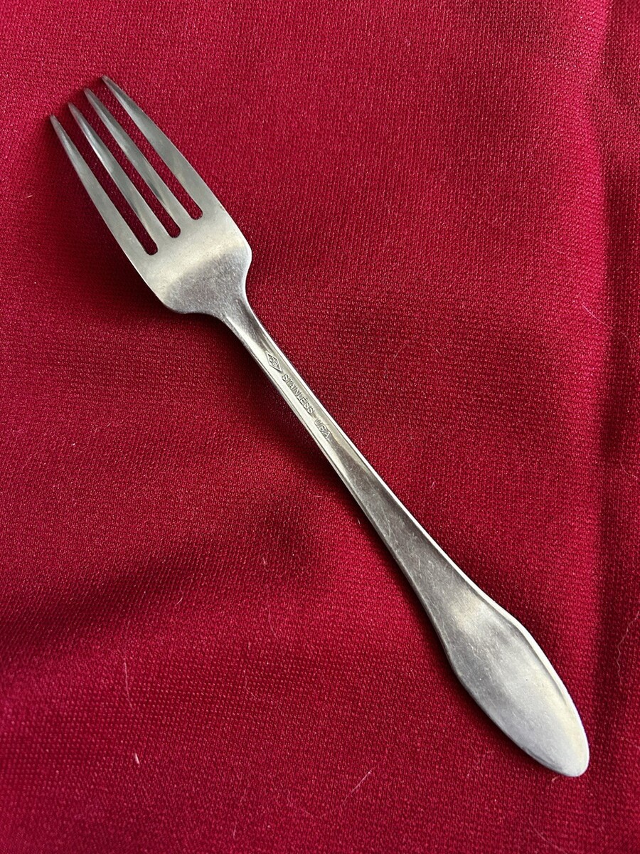 The Vtg New Look Fork by Flint is a vintage flatware piece made in the United States. This stainless steel fork features a classic silver color and a sleek design, measuring 7 inches in length. The handle is also made of stainless steel, reflecting the American culture and style of the brand Flint. Perfect for collectors or those looking to add a unique and nostalgic touch to their kitchen or dining set.