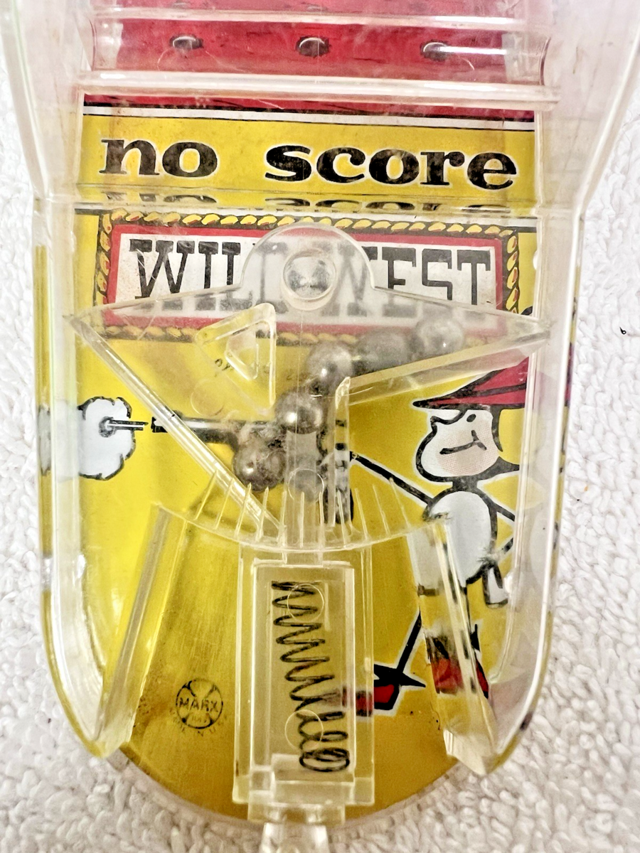 Vintage Miniature Handheld Tabletop Pinball Game Toy Wild West Cowboy Marx Made in USA marked. Small handheld toy pinball game made by Marx Toys measures approx 5 1/2" long and 2" wide. No breaks or cracks in hard plastic, red, yellow and black colors and lettering in very good condition, some surface scratching to plastic, bottom metal very good condition no rusting or marring. See pictures.