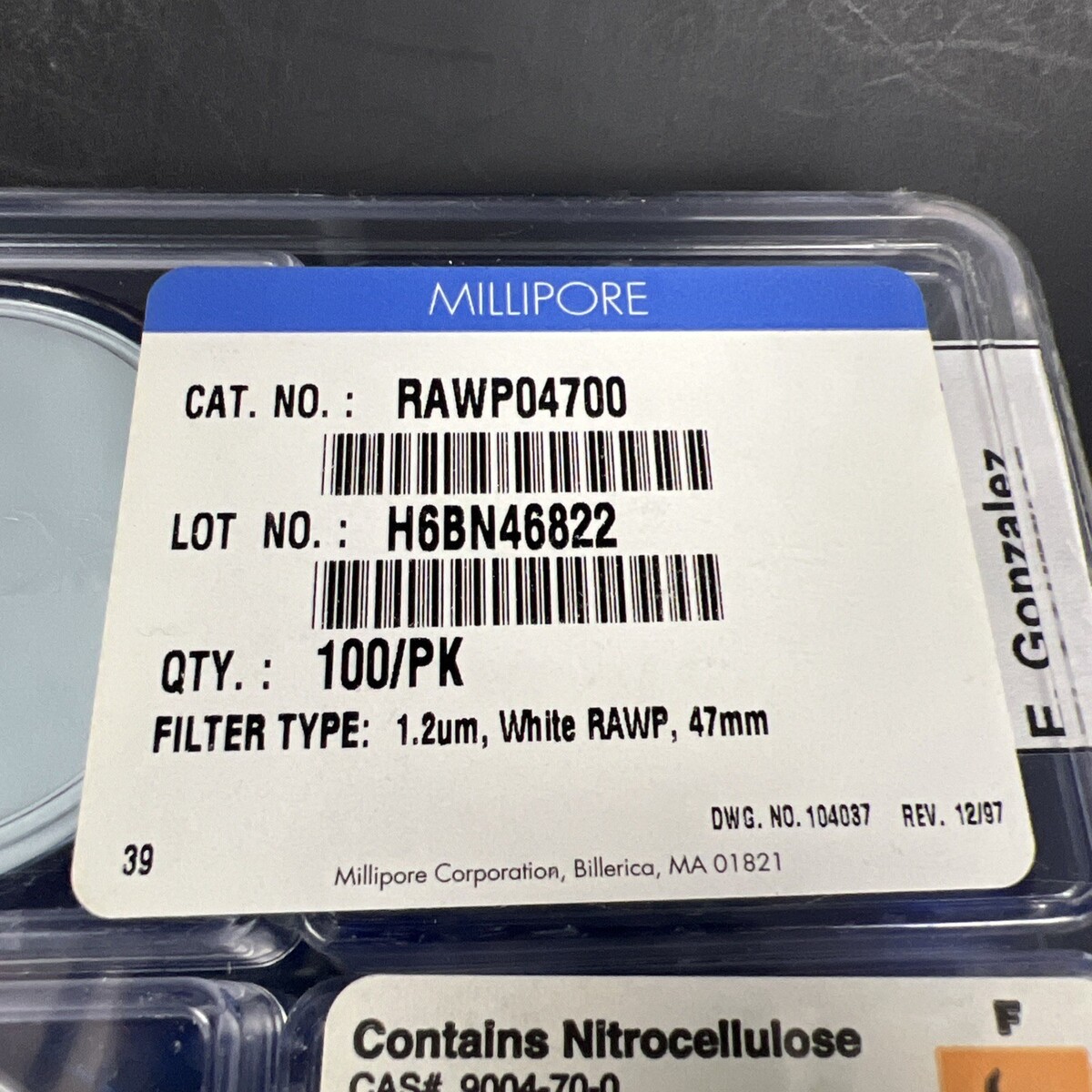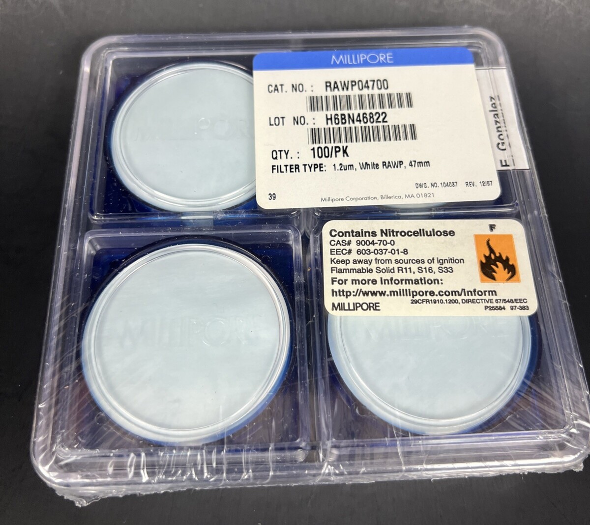 MILLIPORE RAWP04700 FILTERS H6BN46822 100 COUNT 1.2um, White RAWP, 47mm