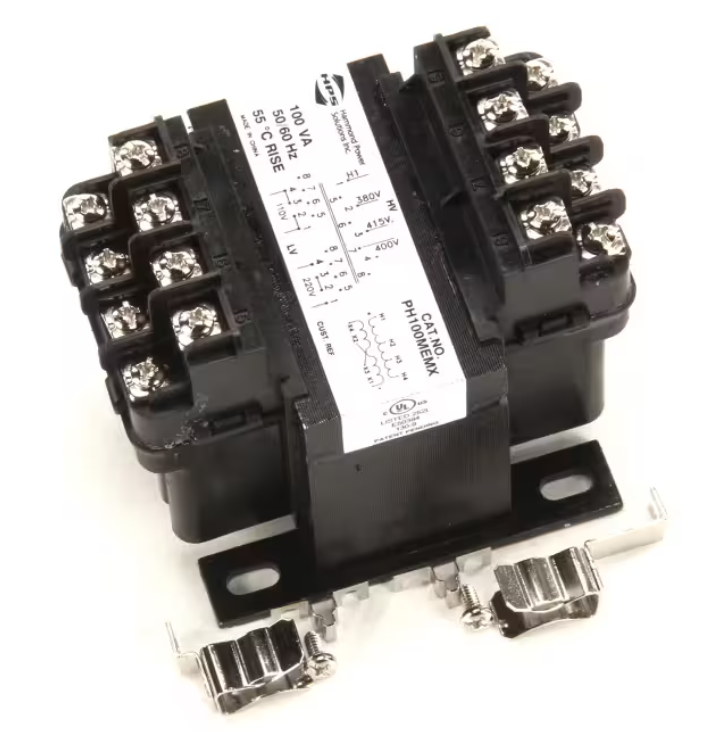 The Cleveland PH100MEMX Transformer (also referenced as KE53838-11) is an OEM step-down power transformer designed for Cleveland horizontal gas agitators. Converting 380/400/415V input to 110/220V output at 50/60Hz with a 100VA rating, this transformer supplies stable control power essential for reliable and safe equipment operation. Built to original manufacturer specifications, it is a direct replacement for commercial kitchen applications.