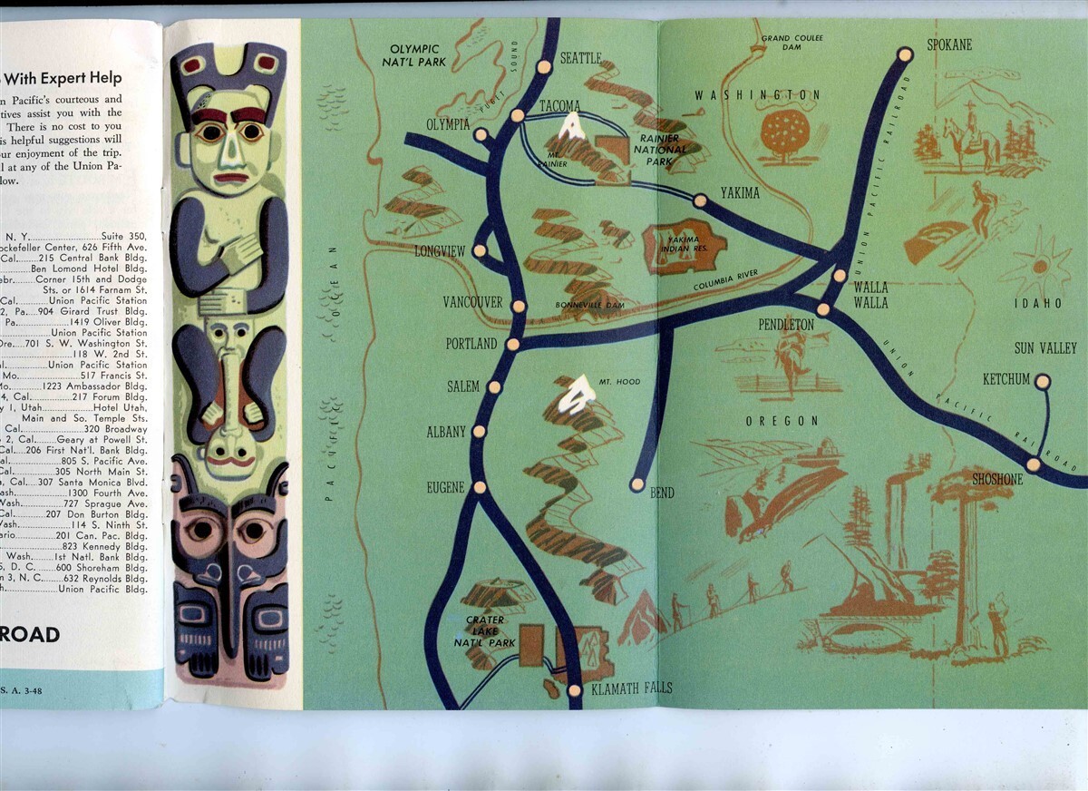 A 48 page booklet with fold out route map and Totem Pole. Union Pacific Railroad Pacific Northwest and Alaska Booklet, dated 1948. Filled with color and B W photos, tourist information, history and much more.