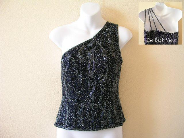 This is a Classy Heavily Beaded Embroidered formal clubbing one shoulder sexy top. A blouse with luxurious blend of colors, textures and design enriched by a unique beads stitching. Attention to detail yields a sturdy, professional costume without equal. Each individual beads creates the design are sewn throughout the blouse.