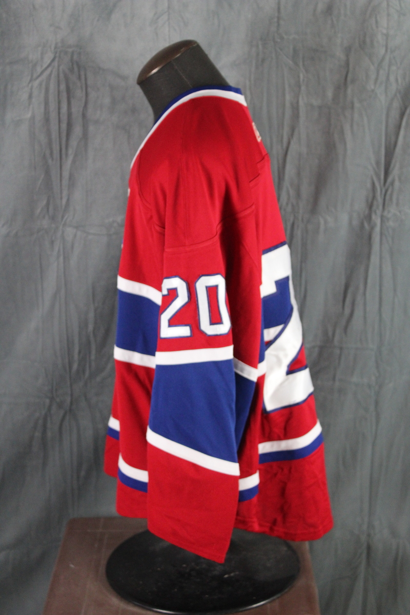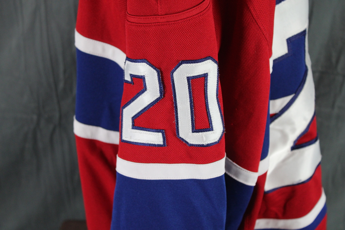Up for sale is a retro Montreal Canadiens jersey by Reebok. It has a red base colour with blue and white trim. The front of the jersey has the number 20 crested on the sleeves and the back of the jersey. The fornt of the jersey has the Canadiens jersey crested on. What a great jersey do not miss out on it.