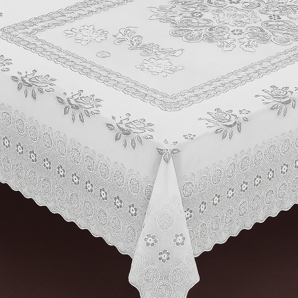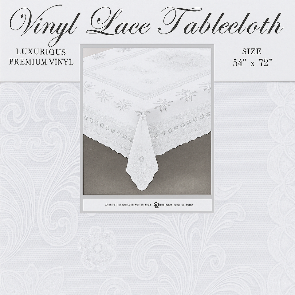 Add a decorative touch to your dining room or kitchen with this elegant vinyl crochet-style tablecloth. Designed to look like delicate lace while offering the durability and easy care of wipeable vinyl.