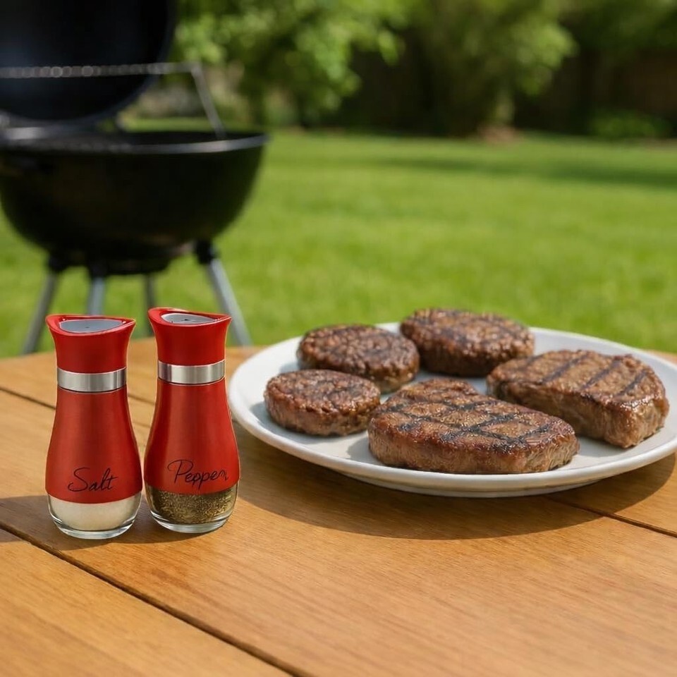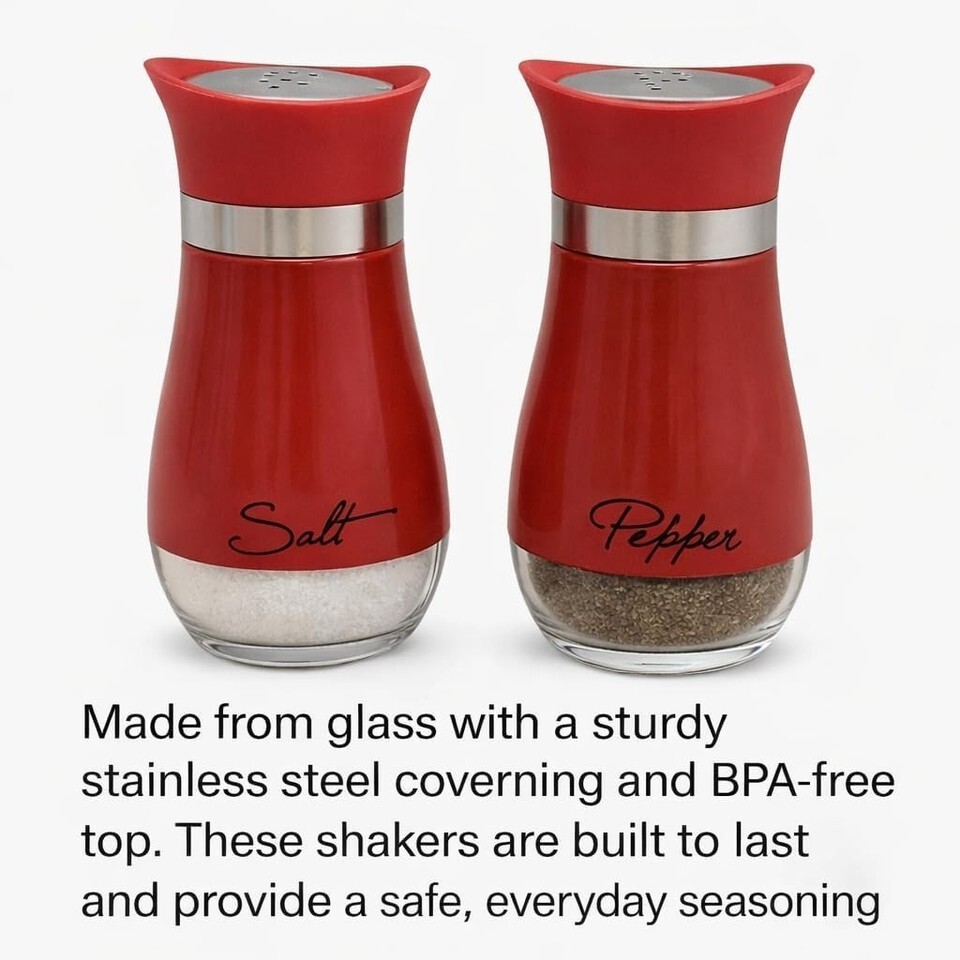 Salt Pepper Shaker Set Glass w/ Printed Labels 4.42 oz BPA-Free Red