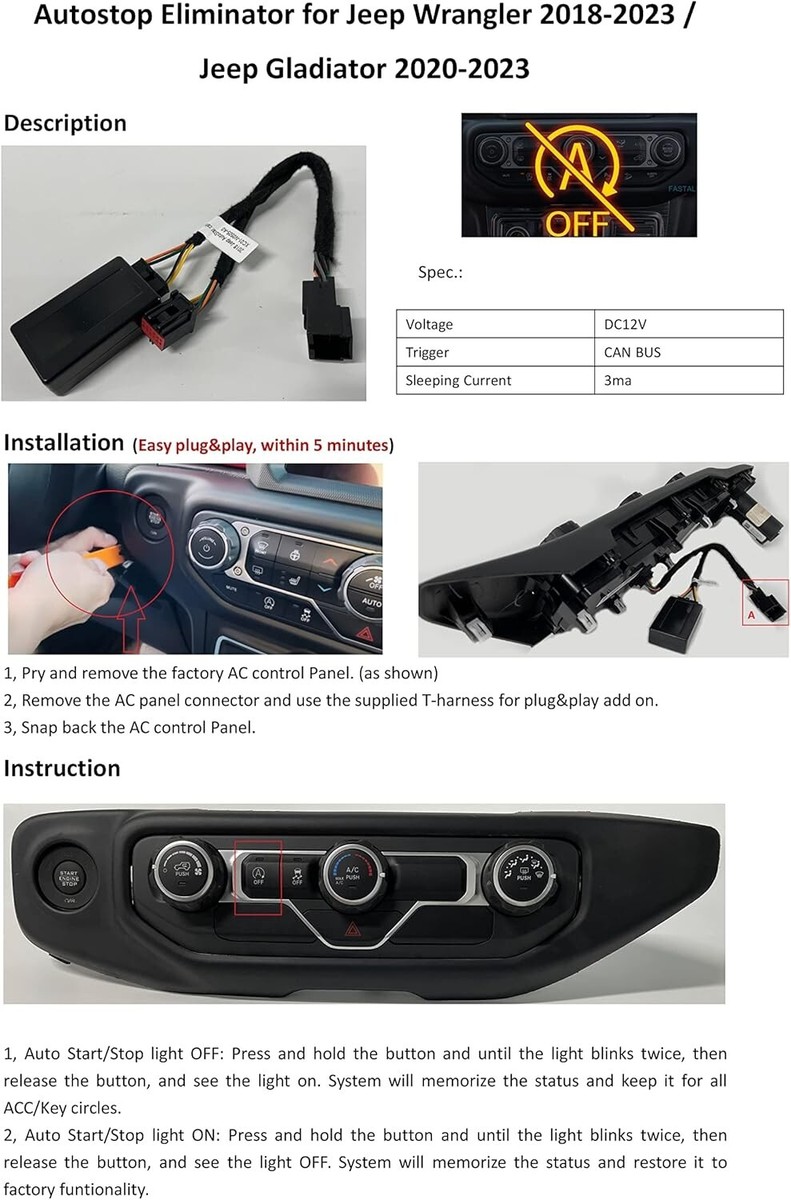 Auto Start Stop Eliminator Compatible with Jeep Wrangler 2018-2023/Gladiator 2020-2023 Engine Automatic A-Off Start Stop Function Plug Play