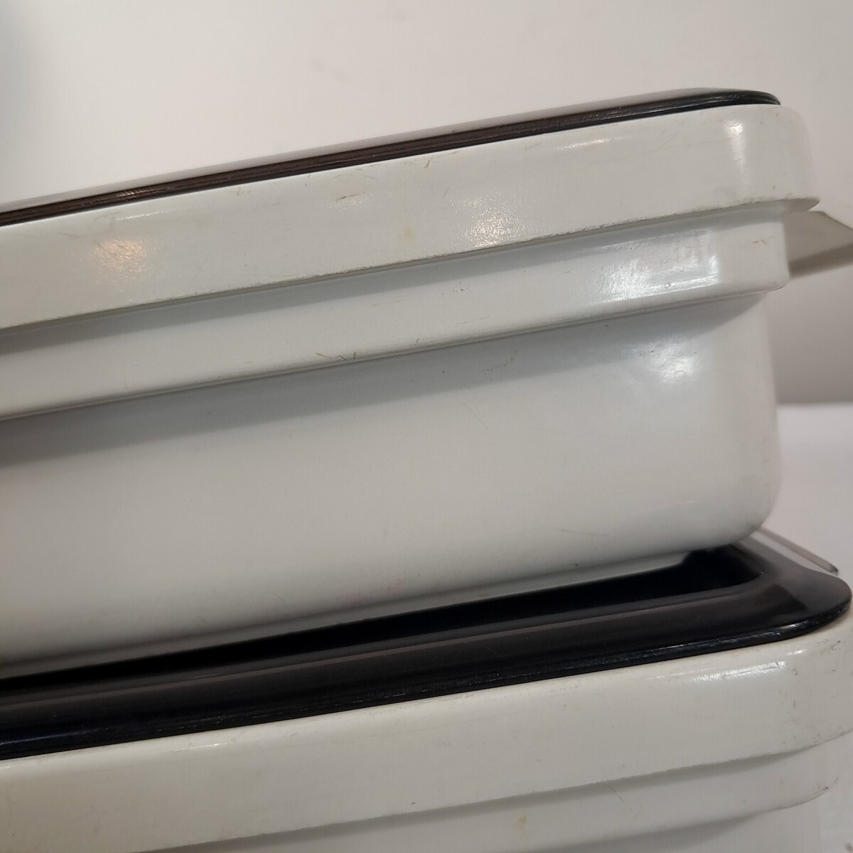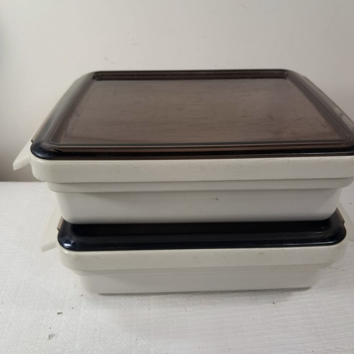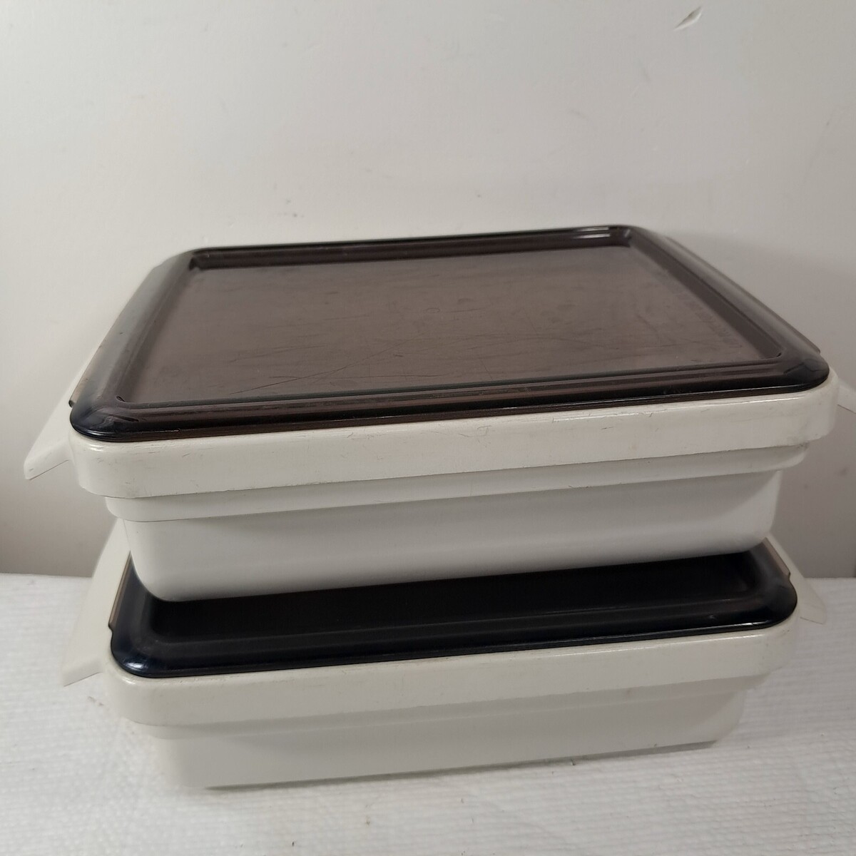 Ivory/cream with smoke brown lids. Set of 2. Both have wear/staining/scratches/marks as shown. See pics.
