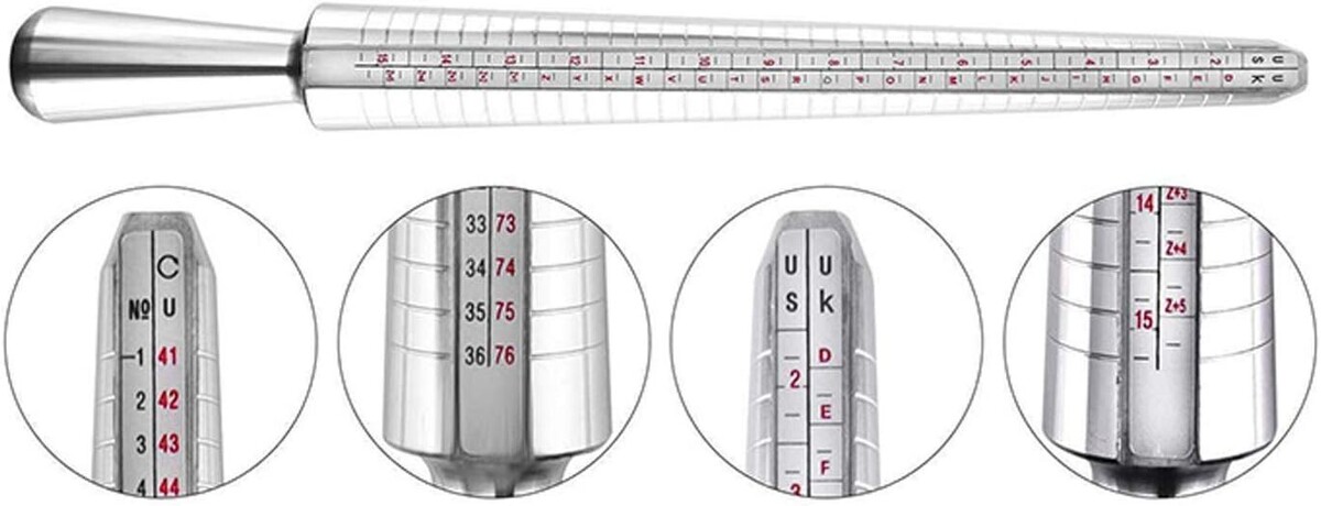 This is a high quality ring mandrel precisely machined and calibrated to the finger gauge. Light weight affordable and accurate measuring tool. Ideal for measuring ring or wedding band sizes. A must for every jeweler. Measures by US and European ring sizes and shows diameter and circumference in millimeters. US sizes 1 to 15, graduated in quarter sizes. Overall length is 10" (254 mm).
