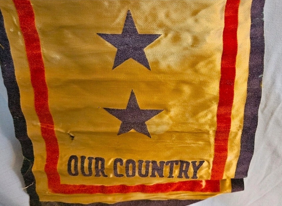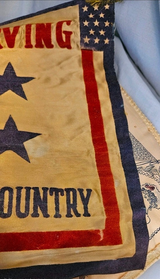 A rare and emotionally powerful pair of original World War I patriotic silk textiles, dating to approximately 1917-1919, when families proudly displayed banners and keepsakes honoring loved ones serving overseas.