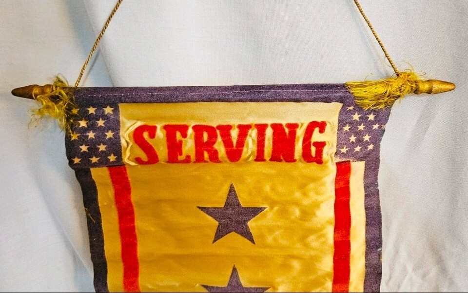 A classic WWI home-front banner featuring two blue stars, signifying two family members in military service. Made of silk with gold tassels and hanging cord.