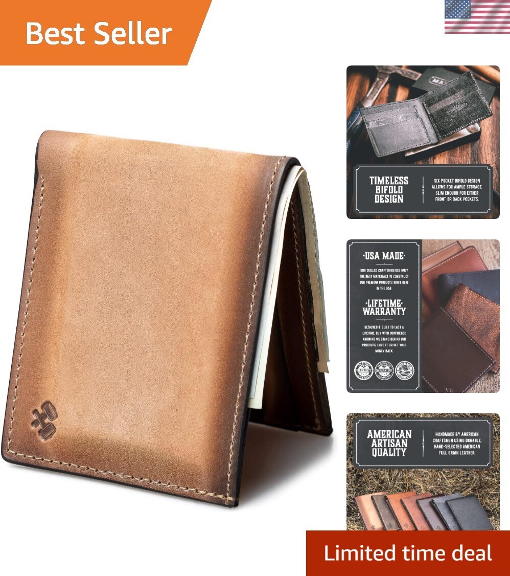 PROUDLY HANDMADE BY AMERICAN CRAFTSMEN FROM FULL GRAIN LEATHER! American made with American Pride! We donat cut corners. No chemical bonded fake leather here, no mass production in China. Our skilled craftsman use only the finest American leather to make handcrafted masterpieces for you and they do it here in the USA! BACKED BY aS ! Upgrade today with no risk. We proudly stand behind each and every product that we sell. You will soon realize that this wallet is one of the best bifold wallets for men available! You will love your new wallet from or your ! TIMELESS BIFOLD DESIGN AND AMERICAN CRAFTSMANSHIP! Each piece of leather is hand selected and sewn to offer a beautiful and uniquely distinct wallet. The six pocket bifold design allows for an ample amount of storage for all your credit cards and a billfold with space for all of your cash. SO COMFORTABLE YOU WILL THROW YOUR OLD WALLET AWAY! Slim enough to be worn in either your front or back pocket comfortably! Your imported department store wallet just canat measure up. Once you feel the difference, The difference, you will only wish you had made the switch sooner! A TIMELESS CLASSIC THAT IS TRULY EYE CANDY! Your wallet will break in to you, just like your favorite pair of jeans. Scratches, scuffs and other minor imperfections add to the unique character and patina only you can develop to make every wallet a one of a kind piece of art. Bifold Leather Wallet for Men Donat settle for anything less than the best! This fashionable wallet is great for any occasion. Its brute strength can hold up to extreme daily use and any other situation you can throw at it. If you compare us to our competition, you will see that the average department store wallet just doesnat measure up. The Bifold Wallet wonat fall apart and disintegrate quickly like the bonded wallets that are everywhere. We provide a because we truly believe this is the best wallet available and we stand behind each and every one we sell. This Bifold Leather Wallet by is made from the strongest and most durable type of leather you can get, full grain leather. This one-piece thick hunk of American Leather is unlike any wallet you have ever tried. Your wallet will begin to show wear as is breaks in to you, just like your favorite pair of jeans. Your wallet will quickly develop a distressed looking patina that is exclusive to your specific wallet. Scratches, scuffs and other minor imperfections only add to the character of your wallet and should not be seen as a defect. If you are looking to get a wallet that can replace all of your other wallets and look darn good doing it then pick up The Bi-Fold Wallet by ! a We still make aem like they used to!