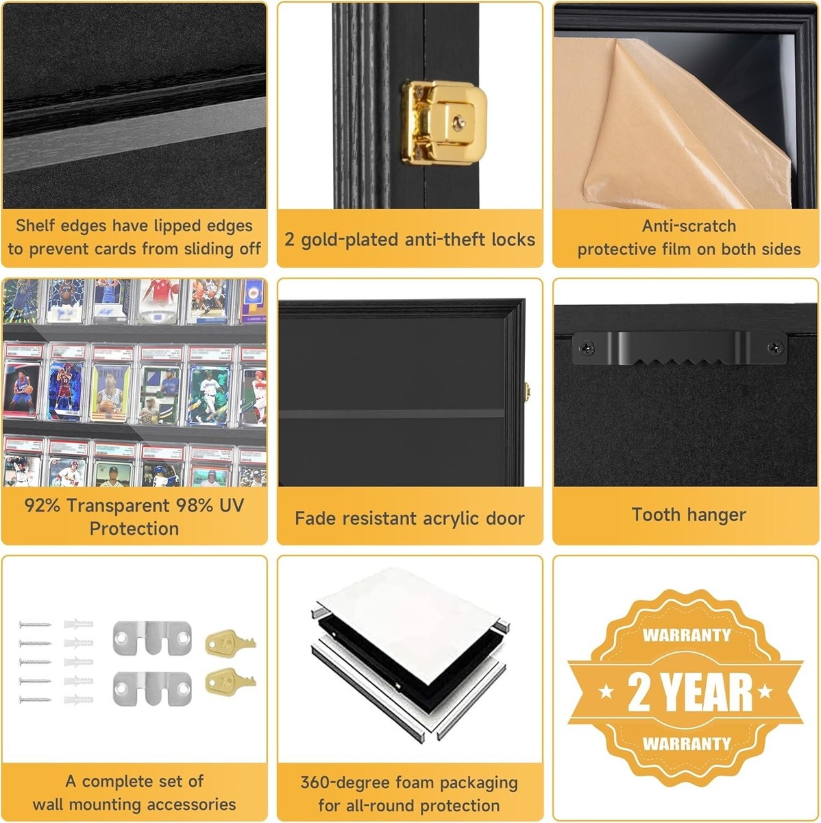 ?Protect Your Cards? baseball card display case is equipped with 2 gold-plated anti-theft locks, protect your precious graded cards from loss, velvety felt lining, delicate and soft, will not cause harm to your cards
