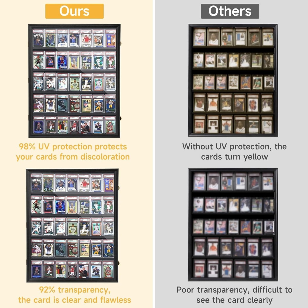 ?Thoughtful Design?Baseball card display case is made of Grade A acrylic with 92% transparency and 98% UV protection. Protect your cards from yellowing over time, provide an ultra-clear view of your sports cards