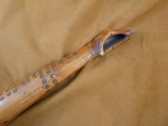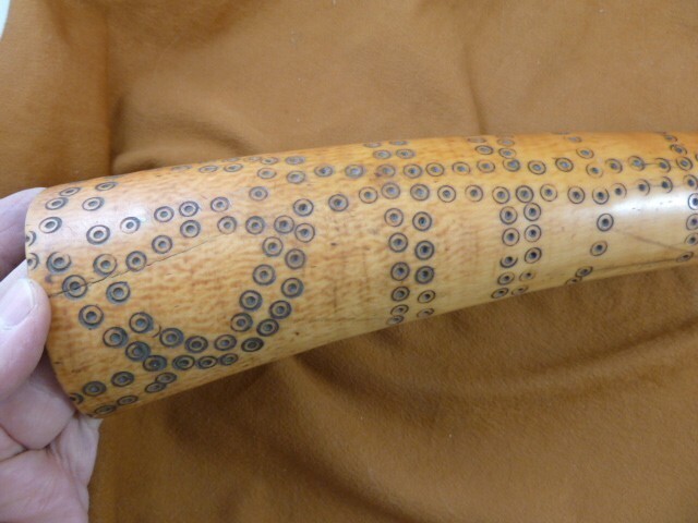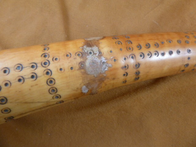 (#W-1-BB) You are bidding on a real genuine, Cow horn, open on both ends; decorative dot pattern etched over all of it; narrow end appears to be broken, scooped area with hole into the rest of the horn. Large end of horn has 3 cracks but stable; cemented material around the middle; believe it to be African.