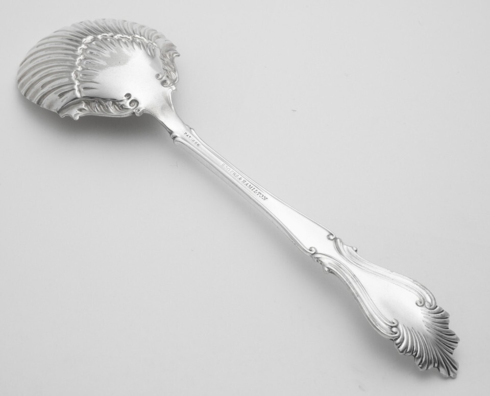 Description: Shell Bowl, Gravy/Sugar Spoon, Silverplate, no monogram, Rococo design.