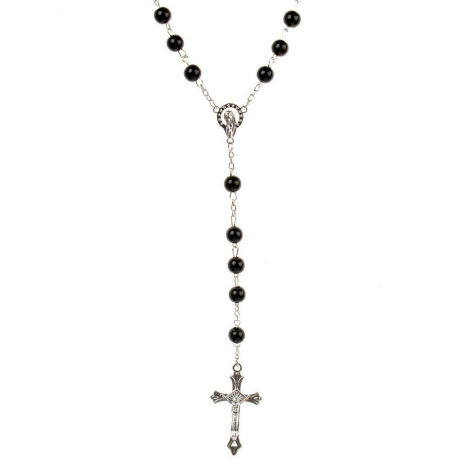 This rosary necklace is hand crafted with alloy metal and black resin beads and arrives to you new in sealed packaging.