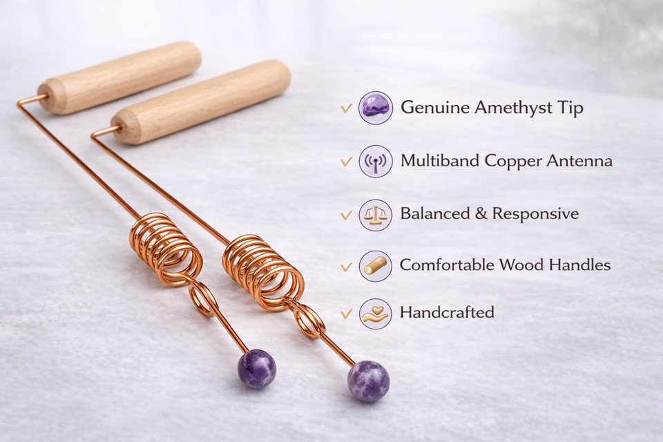 ? Unique Tips: Amethyst tip on a dowsing rod enhance energy harmonization and vibrational sensitivity, aiding in the detection of hidden water sources or energetic structures. It is used to heighten the dowser's energetic awareness during water divination and various bioenergetic practices.